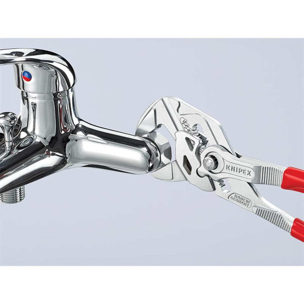 The Knipex 86 03 Series Pliers Wrench with plastic coated handles and smooth parallel jaws for cautious installation of plated fittings or sensitive surfaces. More effective, faster and greater capacity than an adjustable spanner of the same size. Highly suitable for gripping, holding, pressing and bending work pieces. Fast adjustment at the touch of a button with the tool on the work piece. Lever ratio greater than 10-1 for strong gripping power.