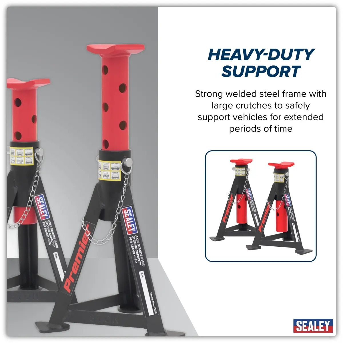 Heavy-duty axle stands to safely support vehicles for extended periods of time. Large crutches for good load distribution. The heavy gauge steel frame and welded construction gives superior strength and safety. All stands feature captive, multi-position pin load support. Sold in pairs. 3 Year Guarantee* The range is available in five colours, for ease of location and visual safety.
