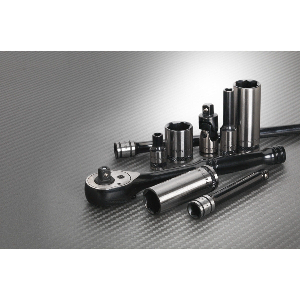 One of a comprehensive range of Premier Hand Tools, suitable for daily professional use. Professional socket set with heat treated Chrome Vanadium steel sockets and accessories. Fully polished black chrome finish with machined and lacquered surfaces. Standard and deep sockets cover sizes from 4 to 14mm. Features 72-tooth flip reverse ratchet wrench with push-button quick release, extension bars, universal joint and T-bar adaptor. Contents: Standard Sockets; 4, 4.5, 5, 5.5, 6, 7, 8, 9, 10, 11, 12, 13, 14mm, Deep Sockets; 4, 4.5, 5, 5.5, 6, 7, 8, 9, 10, 11, 12, 13, 14mm, Extension Bars; 75, 150mm, 1/4"Sq Drive 72-Tooth Flip Reverse Ratchet Wrench with Quick Release, Universal Joint, Spinner Handle, 3/8"Sq Drive - 1/4"Sq Drive Male T-Bar Adaptor. Includes contents map displayed inside the lid. Supplied in metal storage case. Lifetime guarantee*.