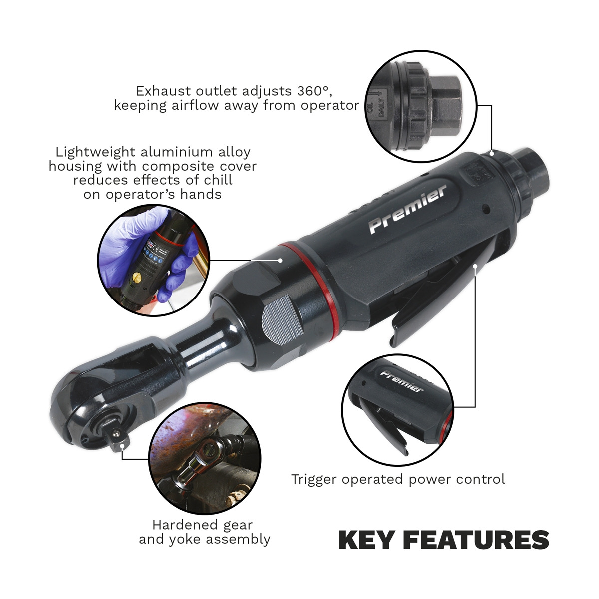 Composite cover moulded around lightweight aluminium alloy housing reduces effects of chill on operator’s hands and provides added control. Air motor with quality bearings for smooth and powerful operation. Exhaust outlet adjusts 360°, keeping airflow away from operator. Compact design is ideal for working around engines where space is limited. Features twist-reverse action and trigger operated power control. Hardened gear and yoke assembly ensures suitability for the professional workshop. 3 Year guarantee*.