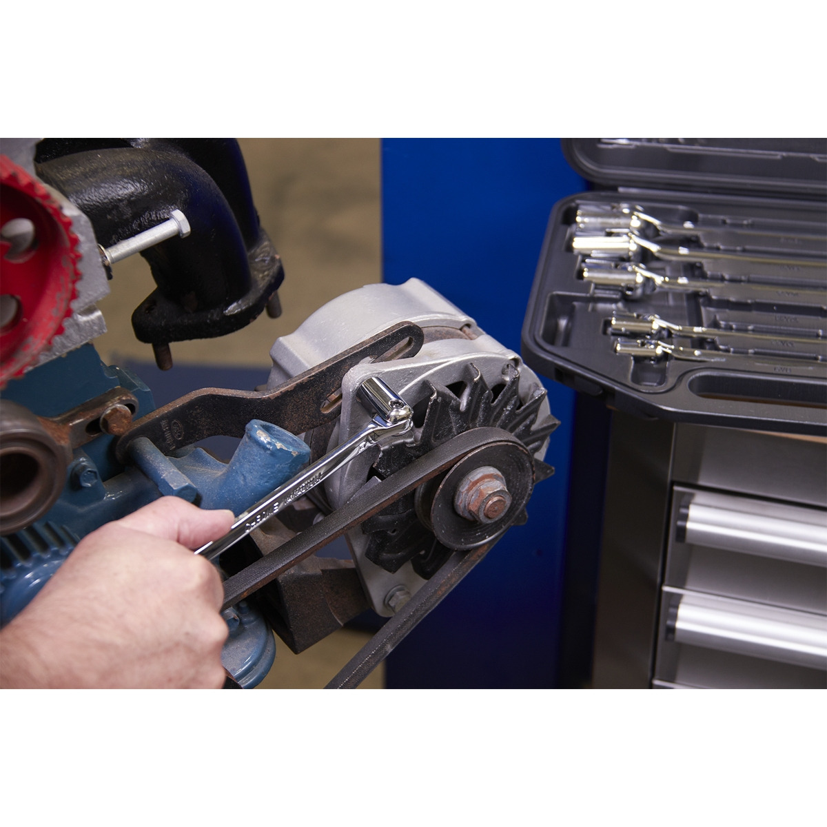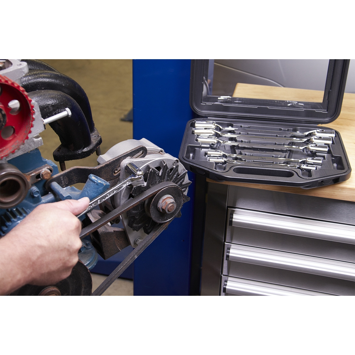 One of a comprehensive range of Premier Hand Tools, suitable for daily professional use. Chrome Vanadium drop-forged steel flexi-head socket spanners with slim style shafts. Hardened and tempered with a fully polished finish for strength and corrosion resistance. Sizes: 8 x 9, 10 x 11, 12 x 13, 14 x 15, 16 x 17, 18 x 19mm. Supplied in storage case. Lifetime guarantee*.