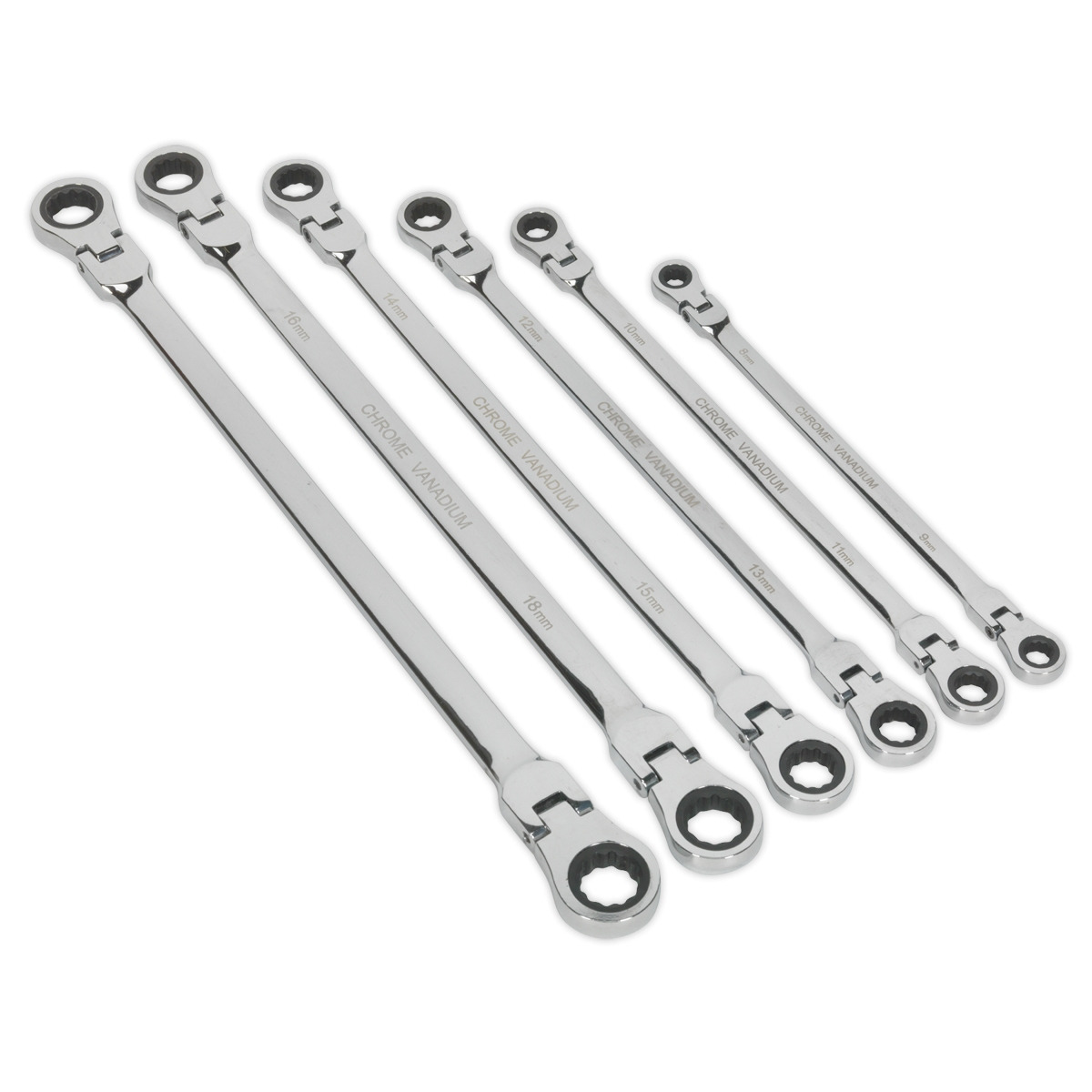 Sealey AK63832 Premier Extra-Long Flexi-Head Double End Ratchet Ring Spanner Set 6pc