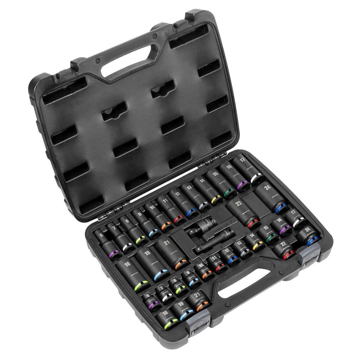 SEALEY PREMIER – One of a comprehensive range of Premier Hand Tools suitable for daily, professional use. HARDENED AND TEMPERED CHROME VANADIUM STEEL – For strength and durability. IMPACT GRADE – Suitable for use with any impact tool. PHOSPHATE FINISH – For added corrosion resistance. 6-POINT WALLDRIVE® SOCKETS – Allow up to 30% more torque to the fixing. COLOUR-CODED WITH ENLARGED SOCKET SIZE PRINT – For quick and easy identification. 36PC SET – Contents includes: Standard Sockets; 6, 7, 8, 9, 10, 11, 12, 13, 14, 15, 16, 17, 18, 19, 21, 22, 24mm, Deep Sockets; 6, 7, 8, 9, 10, 11, 12, 13, 14, 15, 16, 17, 18, 19, 21, 22, 24mm, 75mm Extension Bar, Universal Joint. SUPPLIED IN STORAGE CASE – For easy storage solutions. LIFETIME GUARANTEE*.