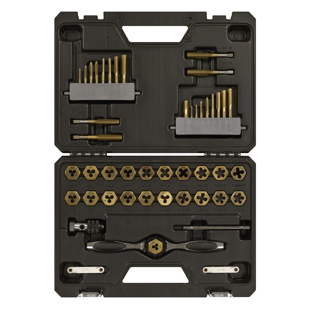 - CONTENTS - Metric Taps & Dies; M2 x 0.4, M3 x 0.5, M4 x 0.7, M5 x 0.8, M6 x 1, M8 x 1.25, M10 x 1.5, M10 x 1, M12 x 1.75, M12 x 1.25, Imperial Taps & Dies; UNC; 6-32, 8-32, 10-24, 12-24, 1/4"-20, 5/16"-18, 3/8"-16, 7/16"-14, 1/2"-13, UNF; 10-32, 2-in-1 T-Type Tap Wrench, 2pc Thread Gauge.