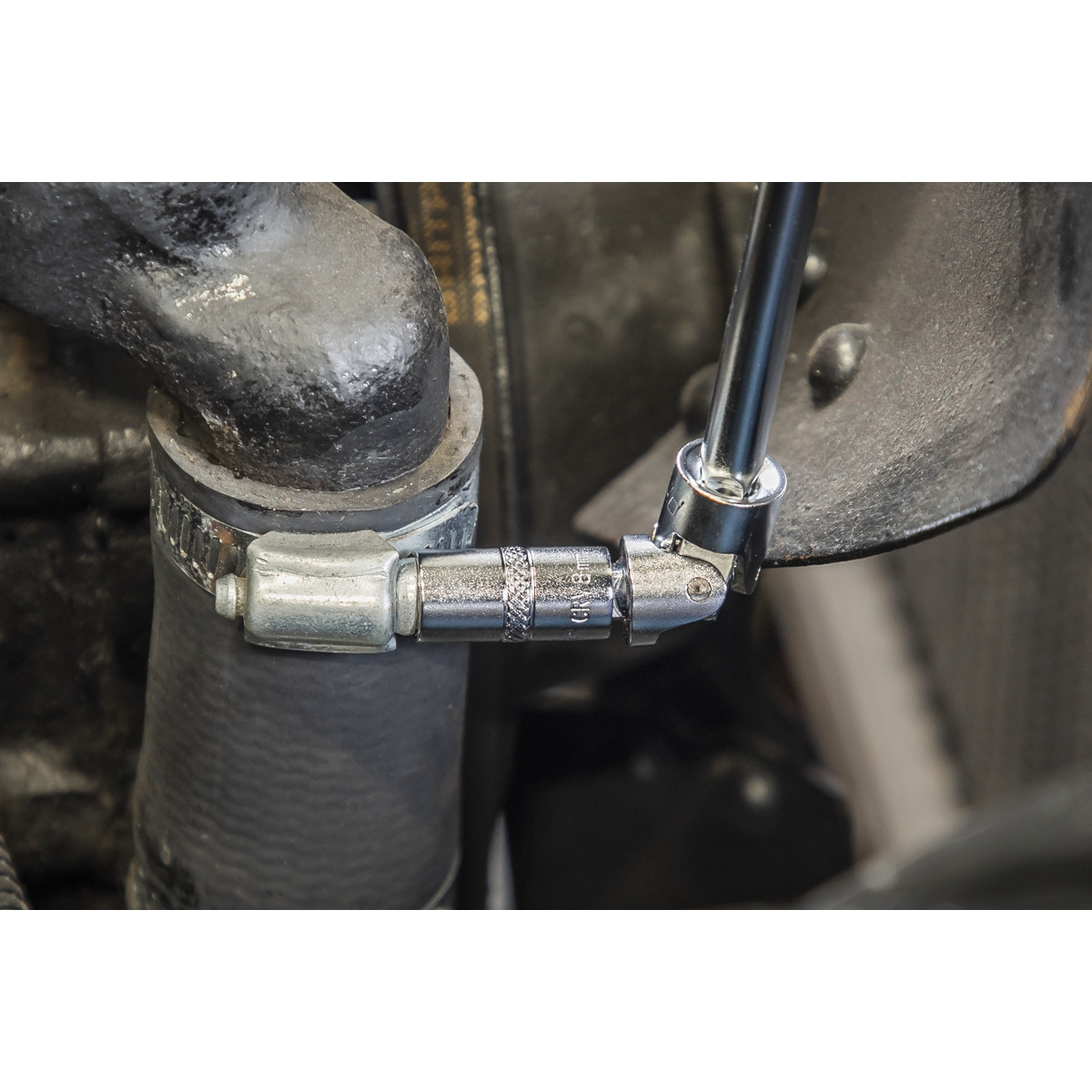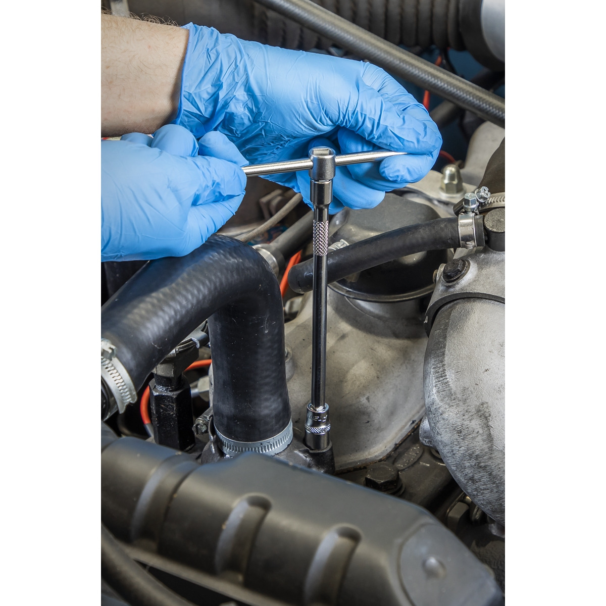- 90-TOOTH RATCHET – Features 90-tooth ratchet wrench with quick release, extension bars, universal joint, sliding T-bar and spinner handle.
