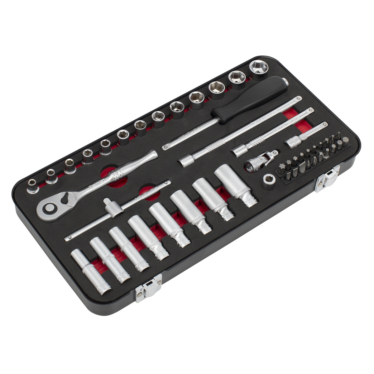 PREMIER PLATINUM – Fully polished micro satin finish. CHROME VANADIUM STEEL – Professional socket set with heat treated Chrome Vanadium steel sockets and accessories. 49PC SET – Covers sizes from 4 to 14mm including deep and standard size sockets. 90-TOOTH RATCHET – Features 90-tooth ratchet wrench with quick release, extension bars, universal joint, sliding T-bar and spinner handle. CONTENTS MAP INSIDE THE LID – Contents includes: Standard Sockets; 4, 4.5, 5, 5.5, 6, 7, 8, 9, 10, 11, 12, 13, 14mm, Deep Sockets; 6, 7, 8, 10, 11, 12, 13, 14mm, 1/4”Sq Drive 90-Tooth Gear-To-Gear Ratchet Wrench with Quick Release, Extension Bars; 50, 100, 150mm, Sliding T-Bar, Spinner Handle, Universal Joint, 1/4"Sq Drive - 1/4"Hex Bit Adaptor, 1/4"Hex Bits; Slotted - 4, 5.5, 8mm, Phillips - #1, #2, #3 Pozi - #1, #2, #3, Hex – 3, 4, 5, 6mm, TRX-Star* - T10, T15, T20, T25, T27, T30, T40. SUPPLIED IN METAL STORAGE CASE – Removable EVA foam tray. LIFETIME GUARANTEE*.