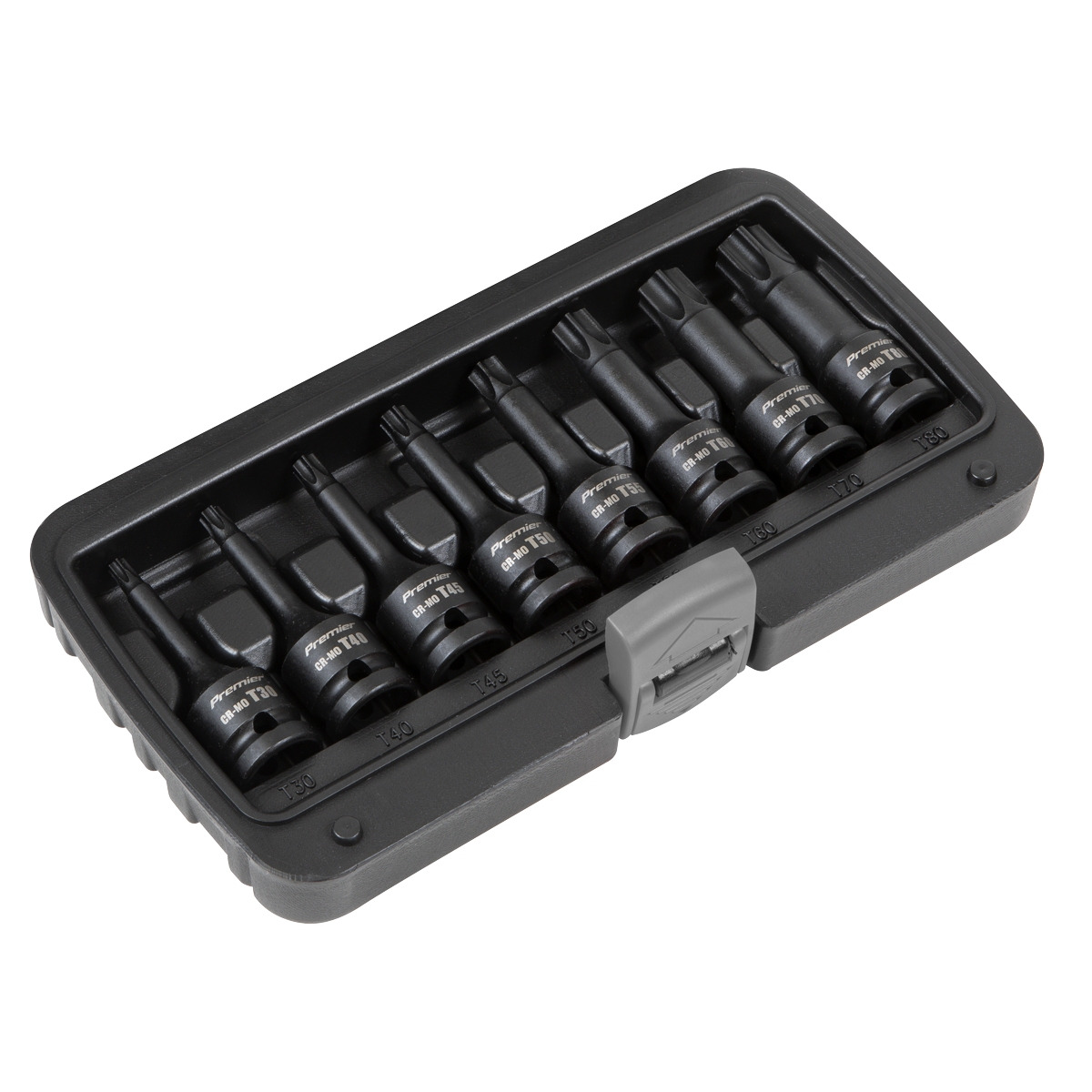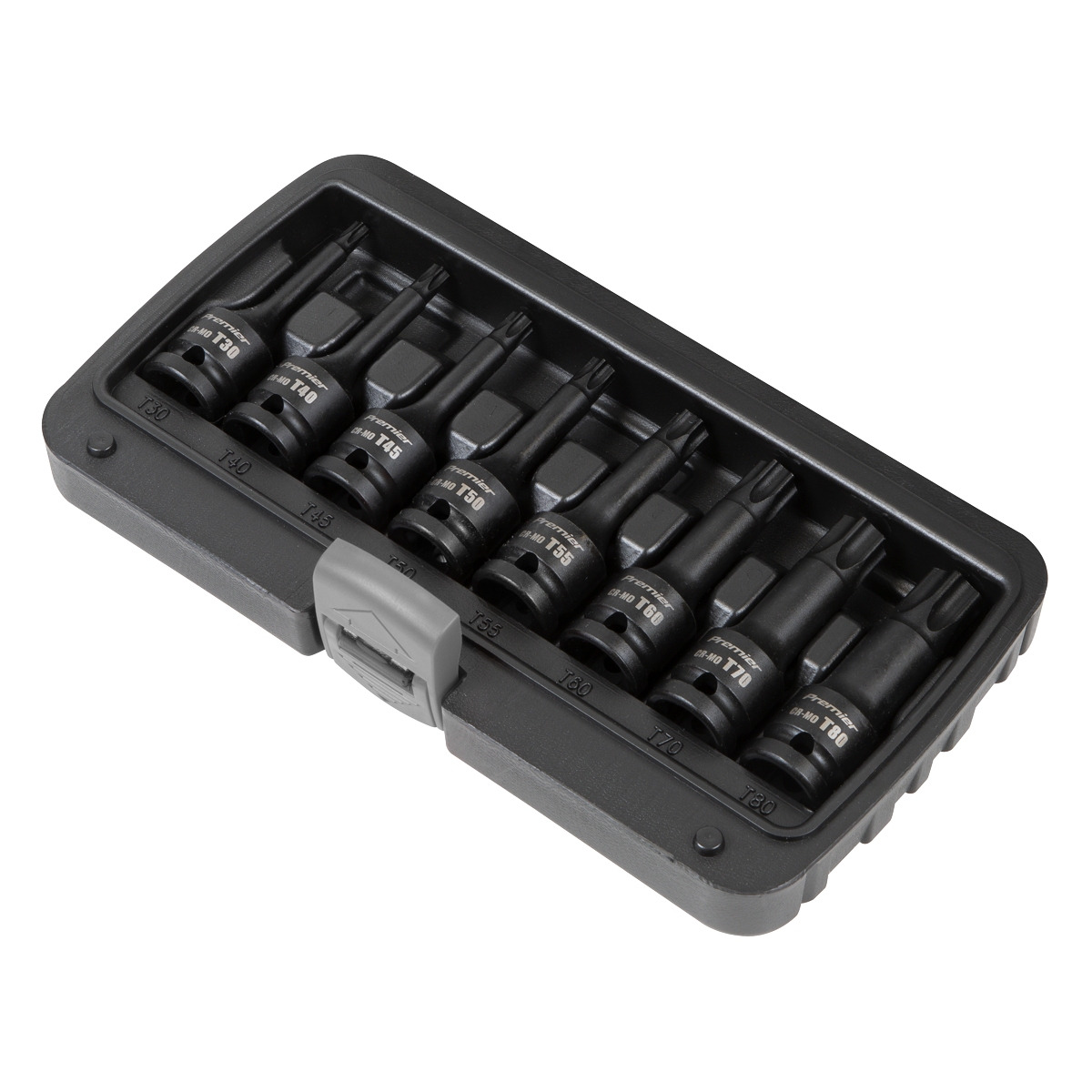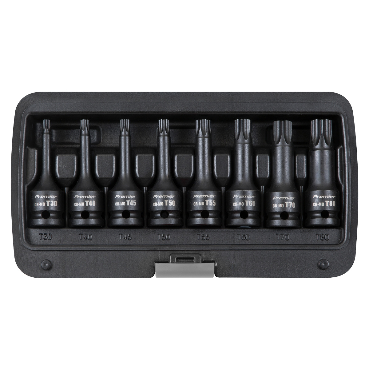One of a comprehensive range of Premier Hand Tools, suitable for daily professional use. Chrome Molybdenum steel impact sockets with 1/2"Sq drive. Phosphate finish for added corrosion resistance. Colour-coded rings for fast identification. Suitable for use with any impact tool. Contents: T30, T40, T45, T50, T55, T60, T70, T80. Supplied on Socket Rail. Lifetime Guarantee*.