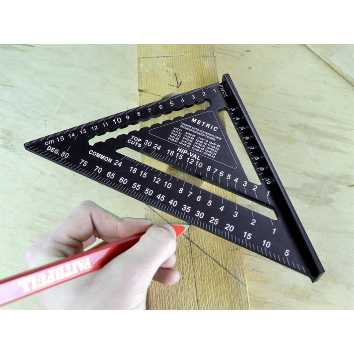 It combines the functions of a combination, try and framing square and can be used to make basic measurements and as a saw guide for 45° and 90° cuts. It can be utilised as a protractor allowing the measurement of angles and pitches. This makes light and fast work of cutting wall shoulders (bird beaks) or rafter ends. Pre-etched points on the square also allows for easy marking on common size timbers.