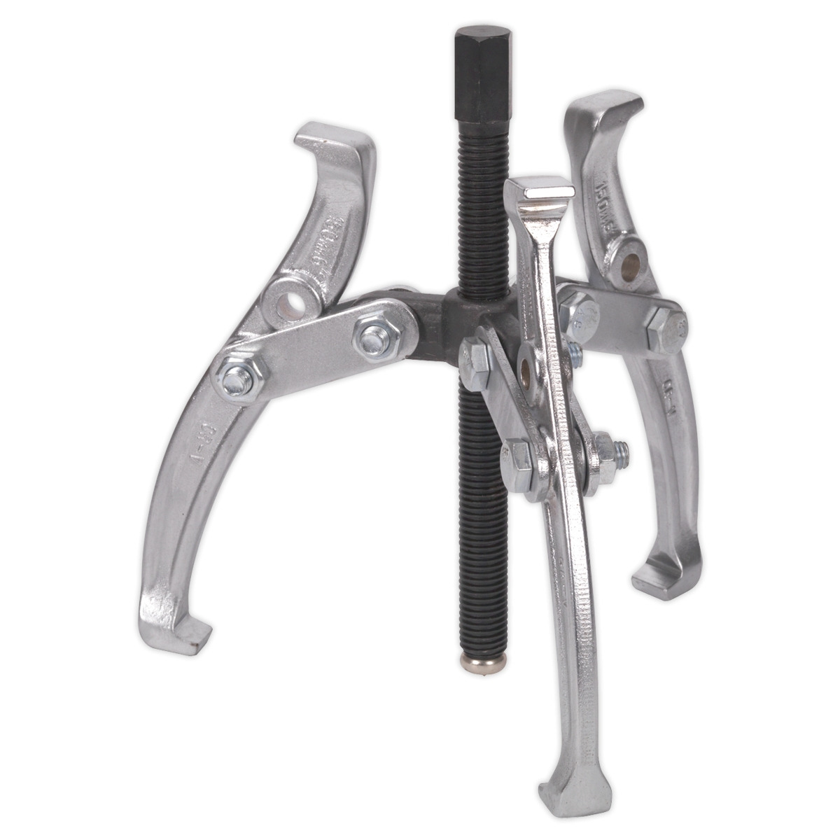 Triple leg puller with reversible, drop-forged, Chrome Vanadium steel legs. Heat treated for added strength and chrome plated to resist corrosion. Swivel thrust plate prevents damage to shaft ends.