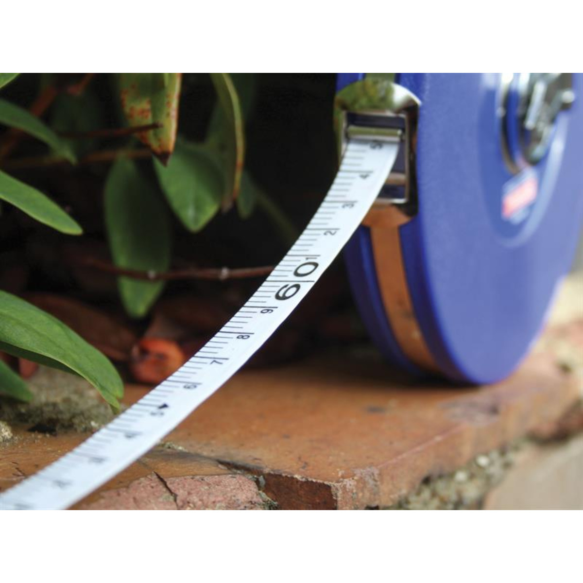 This Faithfull Rounded Long Tape has a 13mm wide blade that is clearly marked out with both imperial and metric measurements. The fibreglass tape is resistant to stretching, scuffs and is impervious to moisture. Its folding metal end claw provides a firm grip when hooked or pressed into the ground. The tape has large and clear measurement increments which are easy to read in almost all-weather conditions, and the tape is easy to clean if it becomes dirty. Stored in a tough closed ABS case, which has a folding metal rewind handle that allows the tape to be quickly rewound after use.