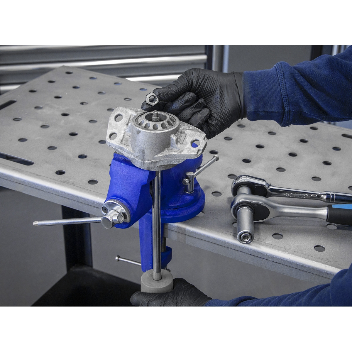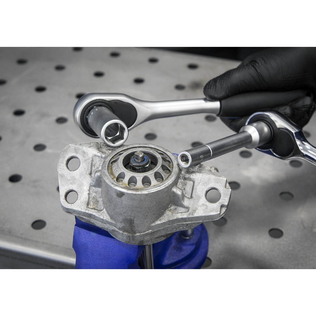 - Permits the removal of the top suspension nut by holding the strut piston, so it doesnt rotate while turning the nut.