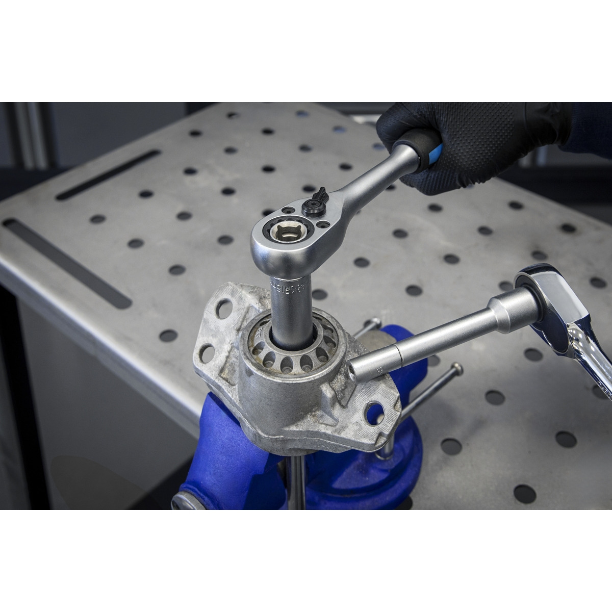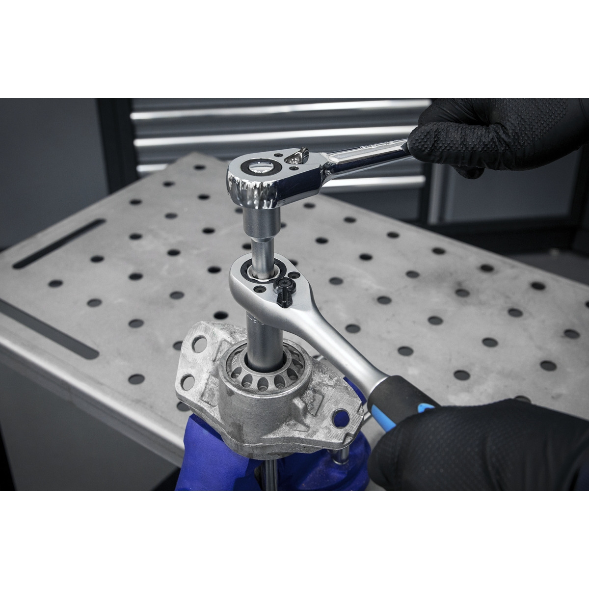 - The go-through design of the socket and ratchet allows the extension to pass through the middle.