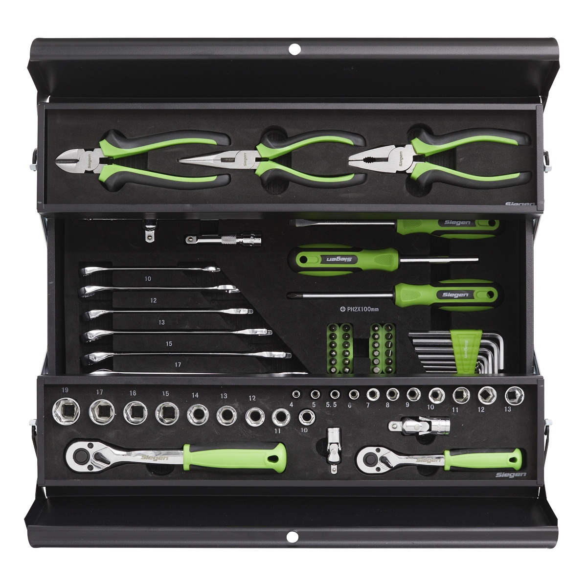 Part of the Siegen by Sealey range of quality tools at competitive prices. 1/4" and 3/8"Sq drive reversible ratchet wrenches. Includes 1/4" and 3/8"Sq drive sockets, hex keys, combination spanners, screwdrivers, bit set and accessories. Tools feature soft grip handles for comfort and control. Supplied in a metal cantilever toolbox. Lifetime guarantee*.