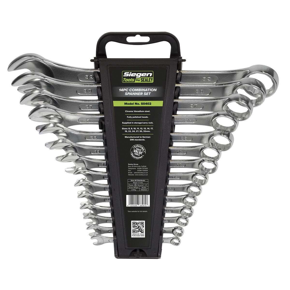 Part of the Siegen by Sealey range of quality tools at competitive prices. Manufactured from Chrome Vanadium steel. Fully polished heads. Made to DIN standards. Supplied in storage/carry rack. Sizes: 8, 9, 10, 11, 12, 13, 14, 17, 19, 22, 24, 27, 30, 32mm. Lifetime guarantee*.