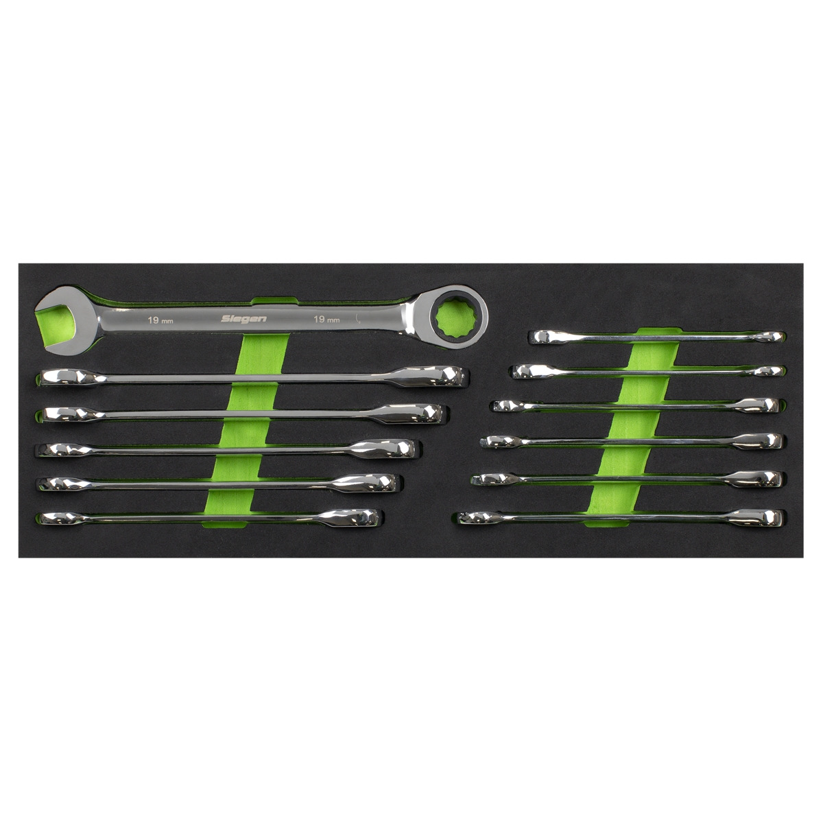 SIEGEN BY SEALEY - Part of the Siegen by Sealey range of quality tools at competitive prices. MANUFACTURED FROM CHROME VANADIUM STEEL – For strength and durability. 72-TOOTH RATCHET AND GEAR SET – Requires only 5° rotation to pick up the next tooth, ideal for applications where space is limited. DOUBLE ENDED COMBINATION SPANNER - 12-piece set including sizes: 8, 9, 10, 11, 12, 13, 14, 15, 16, 17, 18, 19mm. SUPPLIED IN EVA FOAM STORAGE TRAY – For easy storage solutions. LIFETIME GUARANTEE*.