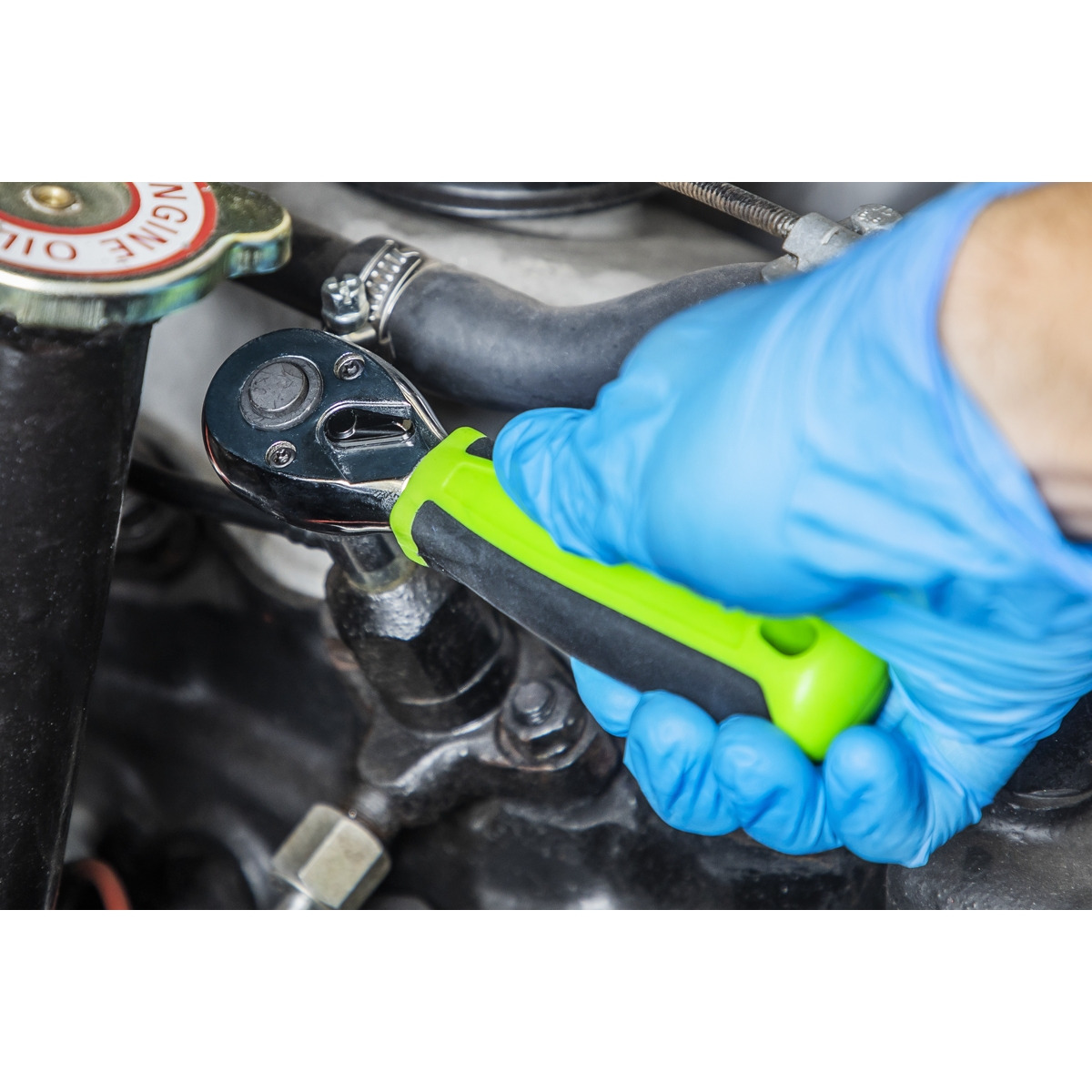 - REVERSIBLE RATCHET - Features pear-head with flip reverse, push-button quick release and anti-slip comfort grip.