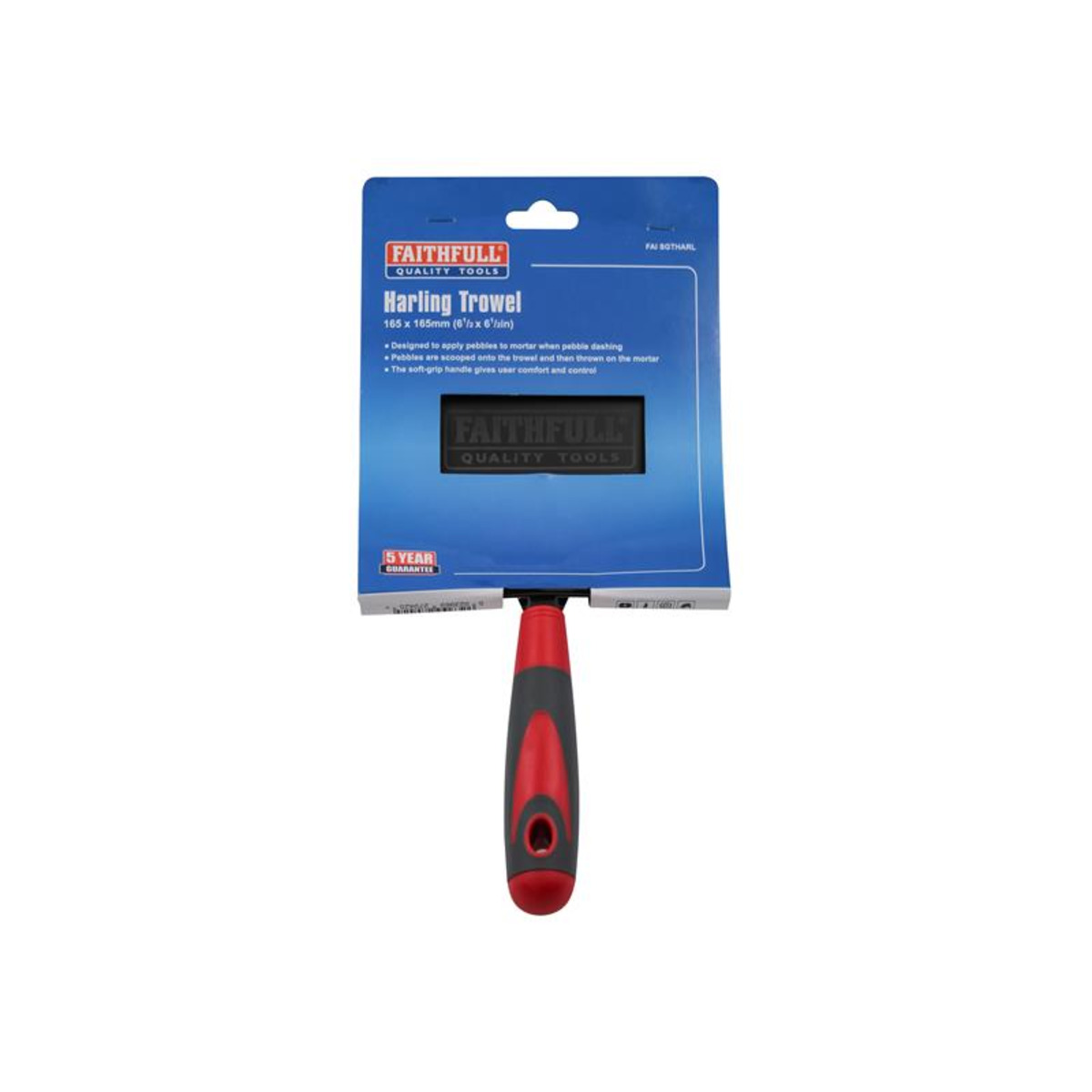 Faithfull Harling trowel with a soft-grip handle. Designed to apply pebbles to mortar when pebble dashing. Pebbles are scooped onto the trowel and then thrown on the mortar. The soft grip handle provides user comfort and control. Size: 165mm² (6.1/2in²).