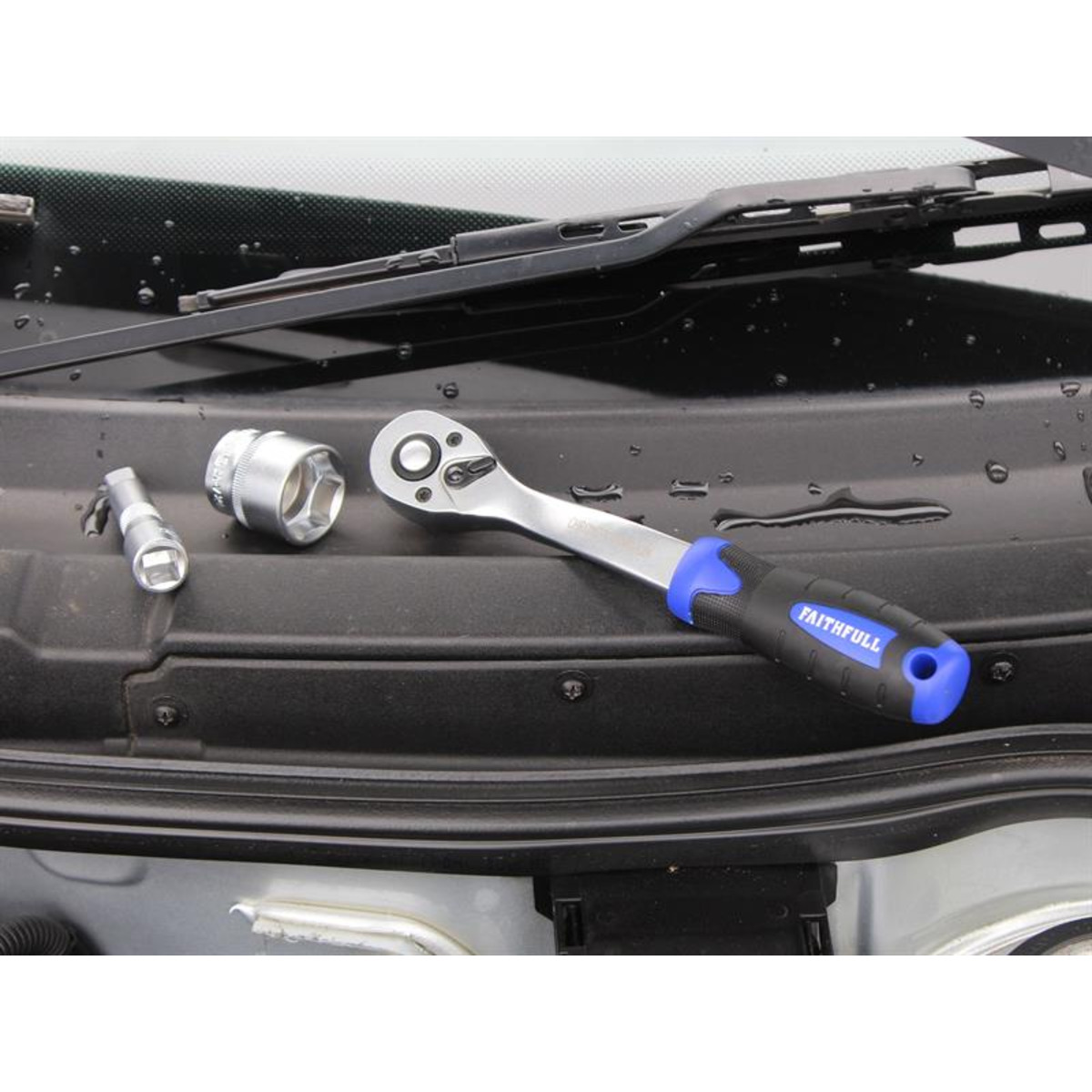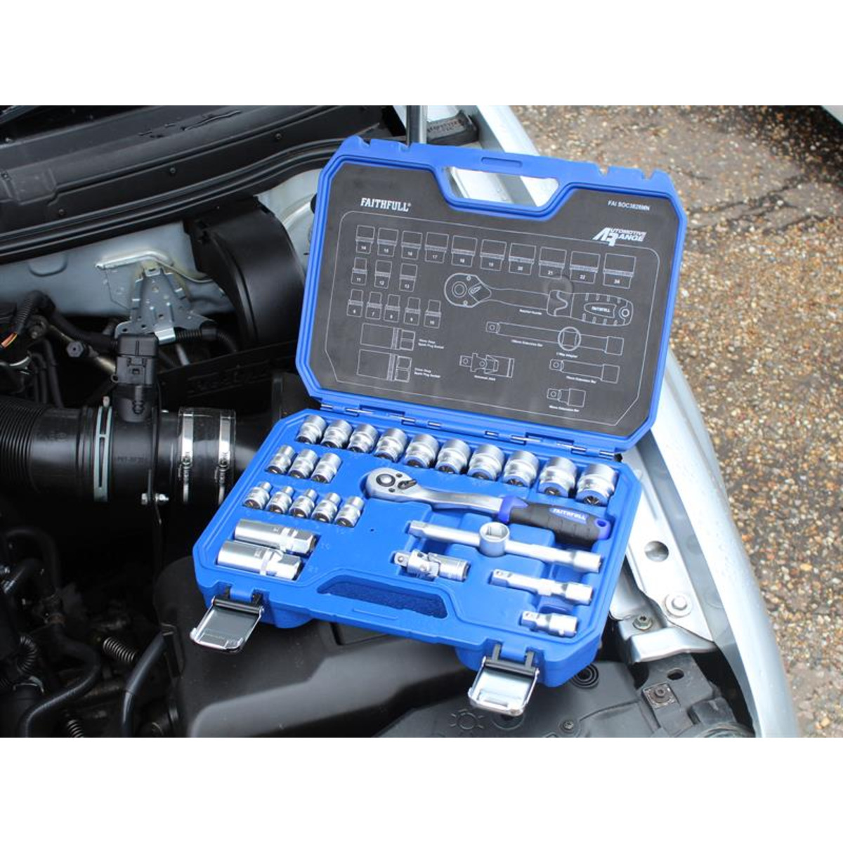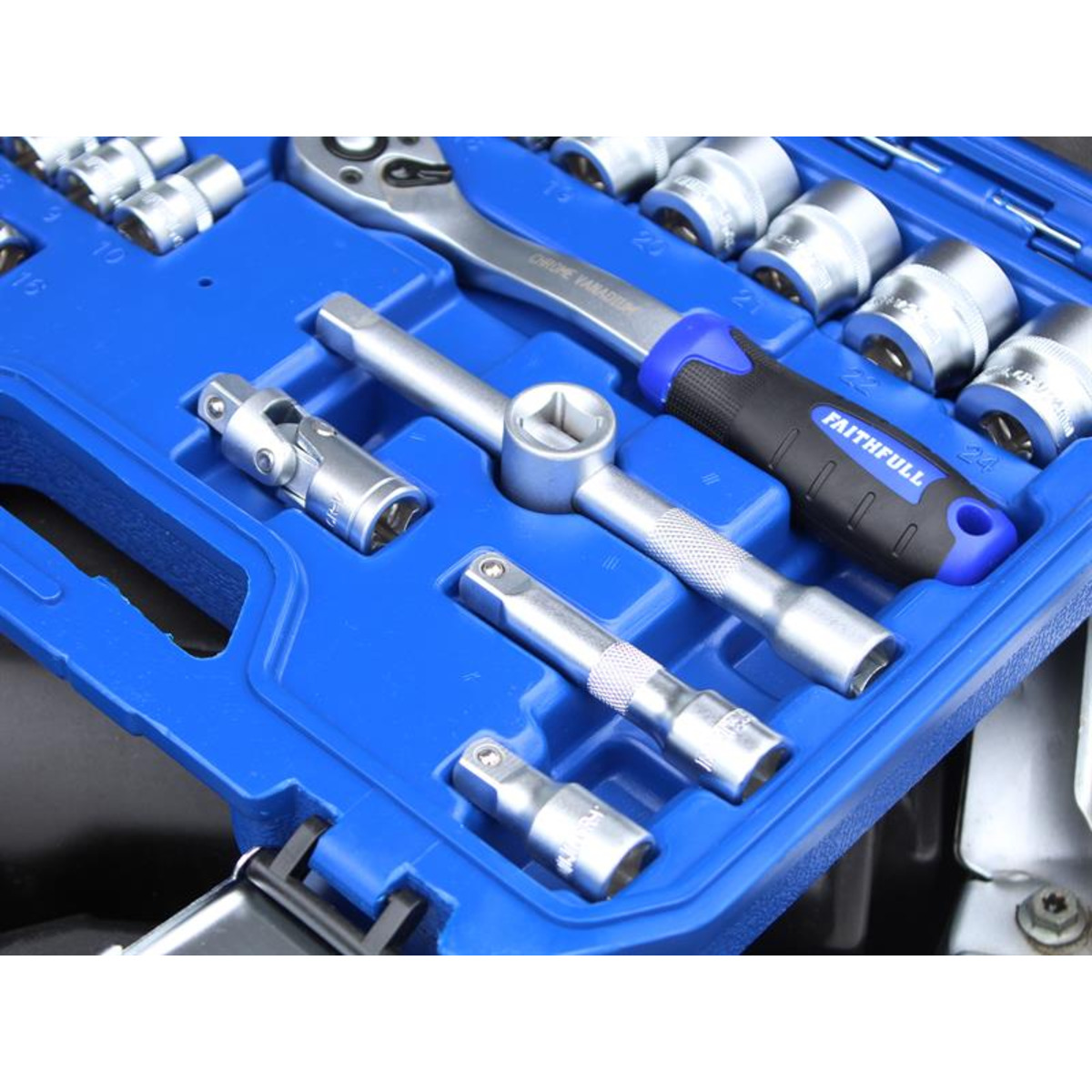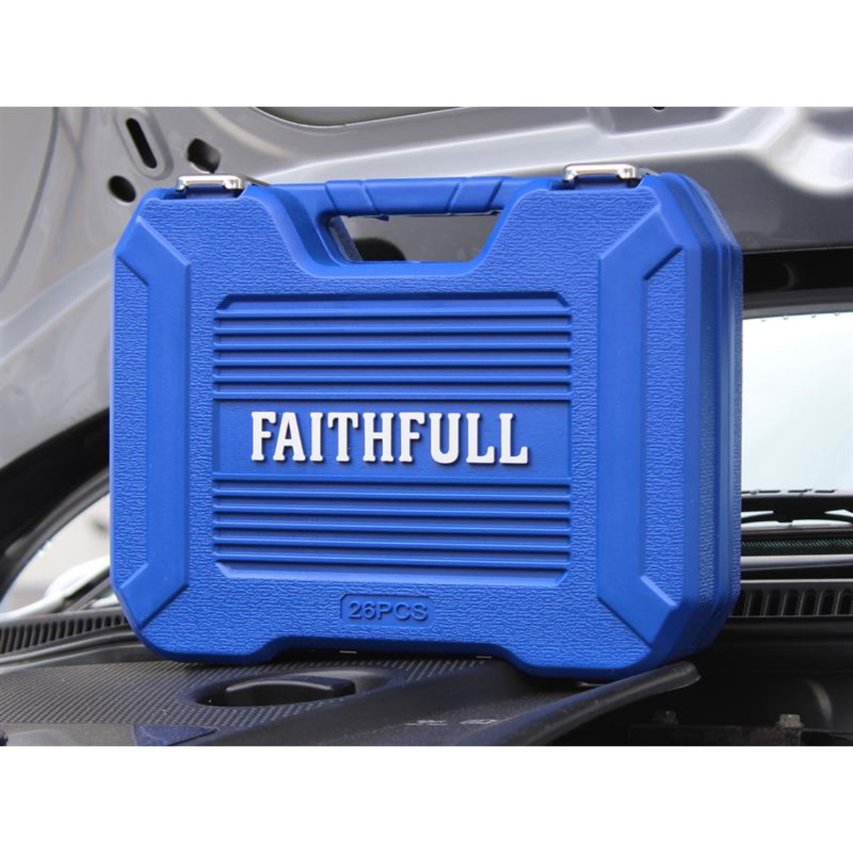 The Faithfull 26 Piece 3/8in Square Drive Socket Set includes a selection of chrome vanadium hexagonal sockets and popular accessories, and features a 72 tooth, smooth action, soft grip ratchet handle with a quick-release mechanism.