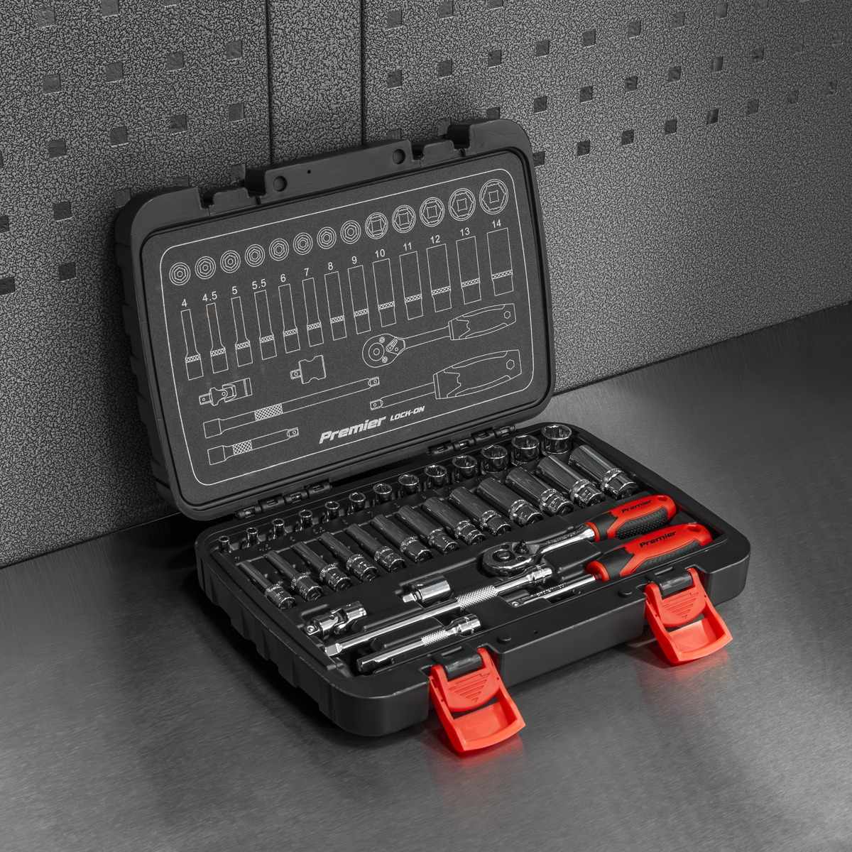 SEALEY PREMIER - One of a comprehensive range of Premier Hand Tools, suitable for daily and professional use. DURABILITY - Heat-treated, drop-forged Chrome Vanadium sockets and accessories with a fully polished mirror finish. LOCK-ON - Features specially machined flutes in the walls of the socket which enable use on up to 85% rounded fasteners. This not only provides added strength but also prevents damage to worn or rusted fixings. 72-TOOTH RATCHET – Enables precise tightening in 5° increments. Features flip reverse with quick-release button for easy socket removal. 32-PCS SET – Includes a 72-tooth ratchet, standard and deep sockets, extension bars, universal joint, Spinner handle and T-Bar adaptor. CONTENTS MAP – includes a contents map displayed inside the lid. STORAGE – Supplied in storage case. LIFETIME GUARANTEE*.