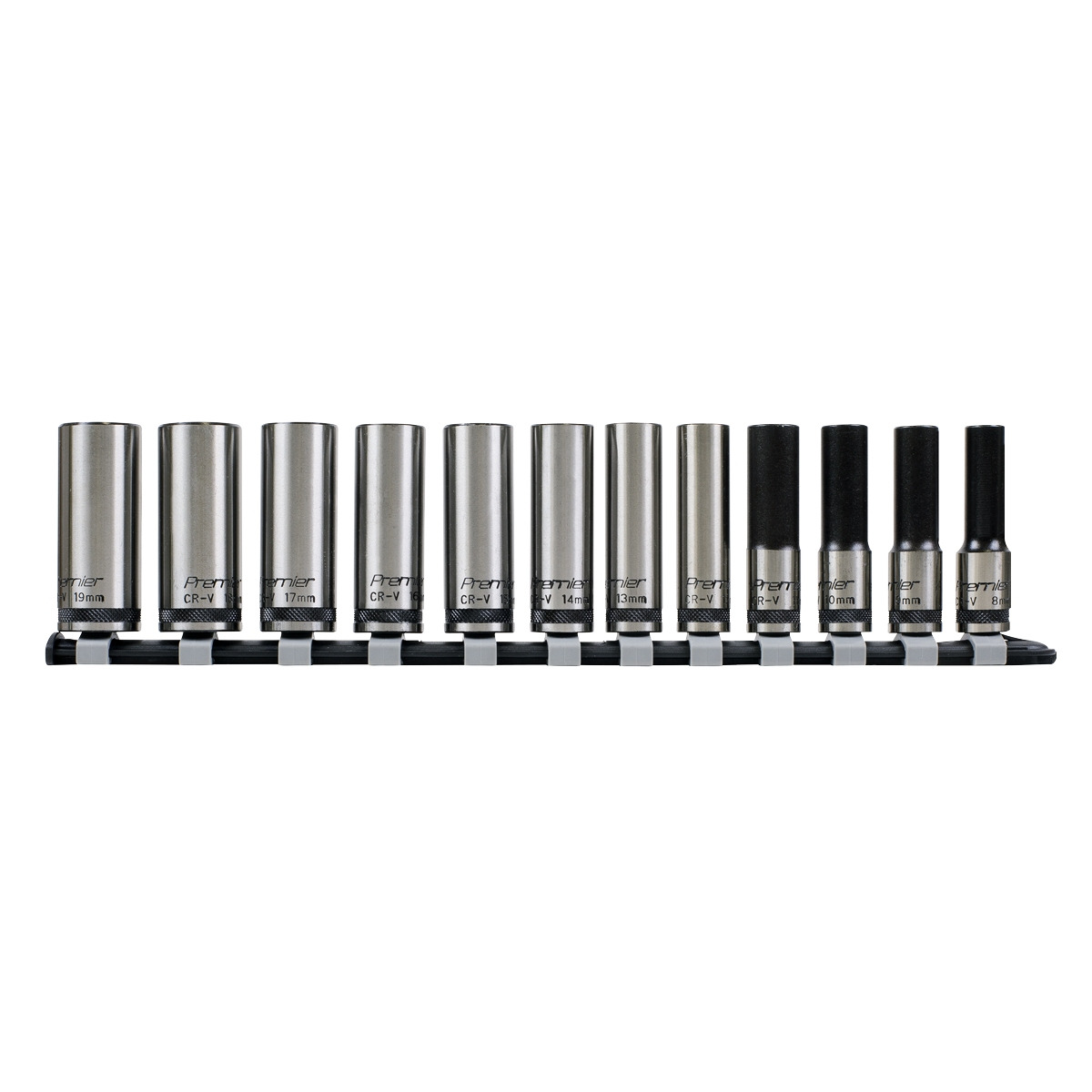 One of a comprehensive range of Premier Black Hand Tools, suitable for daily professional use. Manufactured from hardened and tempered high grade Chrome Vanadium steel. Fully polished black chrome finish for resistance to corrosion. Features specially machined flutes in the walls of the socket which enable use on up to 85% rounded fasteners. This not only provides added strength but also prevents damage to worn or rusted fixings. Contents: 8, 9, 10, 11, 12, 13, 14, 15, 16, 17, 18, 19mm. Includes knurled ring for extra grip with oily fingers. Supplied on socket rail. Lifetime guarantee*.