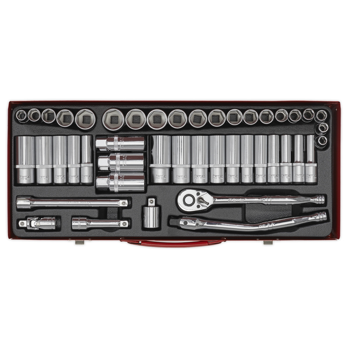 One of a comprehensive range of Premier Hand Tools, suitable for daily professional use. Deluxe professional socket set with heat treated Chrome Vanadium steel WallDrive® sockets. Dual satin/chrome finish. 48-Tooth gear-to-gear quick release ratchet. Chrome Vanadium WallDrive® standard and deep sockets up to 13/16"/22mm. Supplied in metal storage case. Lifetime guarantee*.
