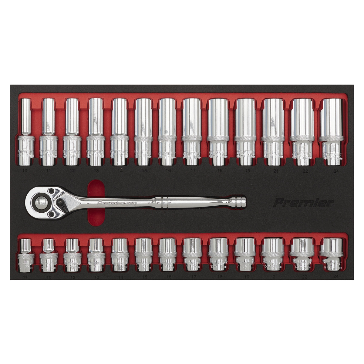 One of a comprehensive range of Premier Hand Tools, suitable for daily professional use. Deluxe professional socket set with standard and deep heat treated mirror polished Chrome Vanadium steel sockets. Slim style contoured handle 72-tooth ratchet wrench with flip reverse and quick release mechanism. Socket Sizes: Standard and Deep; 10-24mm. 1/2"Sq Drive; Standard Sockets - 10, 11, 12, 13, 14, 15, 16, 17, 18, 19, 21, 22, 24mm, Deep Sockets - 10, 11, 12, 13, 14, 15, 16, 17, 18, 19, 21, 22, 24mm, 1/2"Sq Drive 72-Tooth Ratchet Wrench. Supplied in EVA storage tray. Lifetime guarantee*.