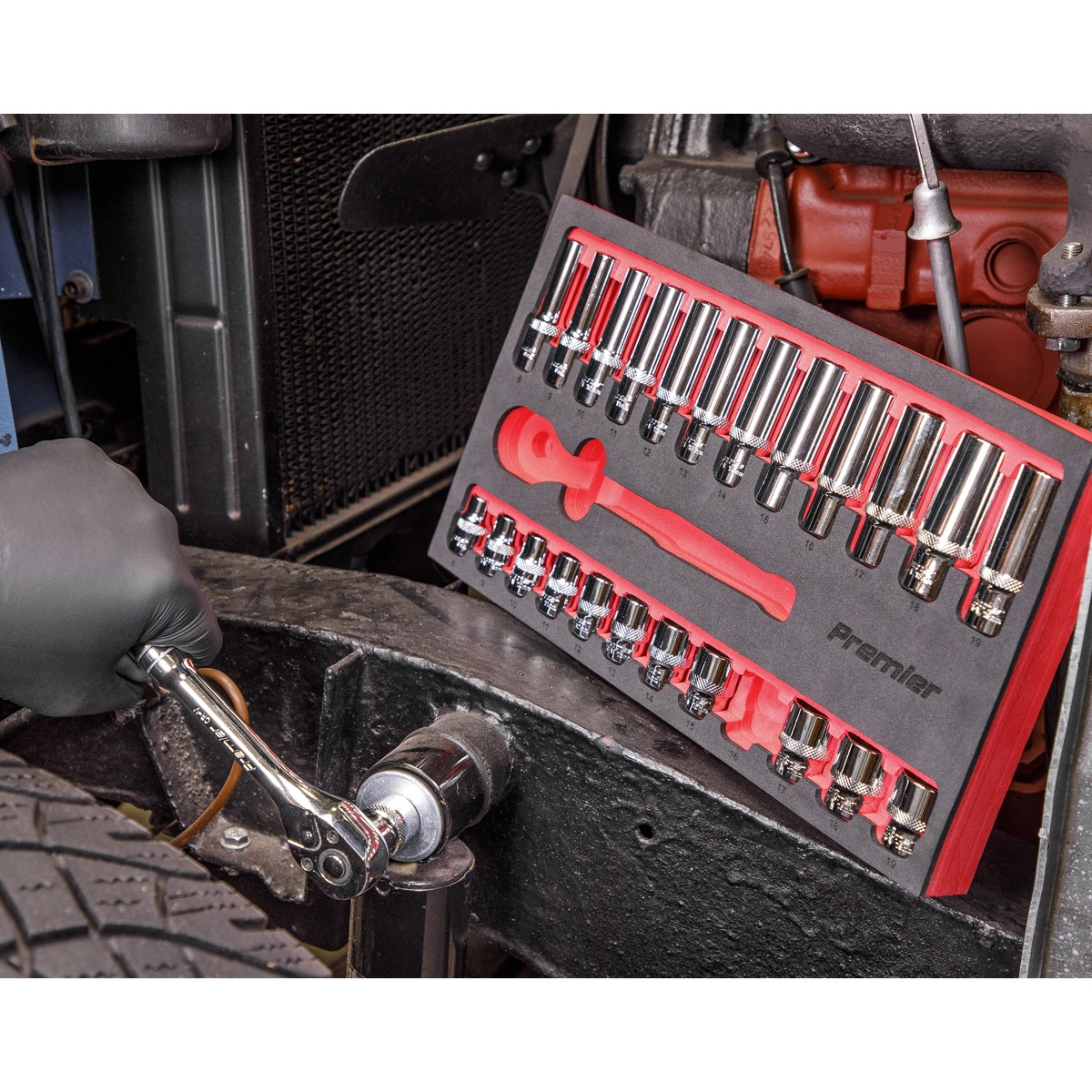 One of a comprehensive range of Premier Hand Tools, suitable for daily professional use. Deluxe professional socket set with standard and deep heat treated mirror polished Chrome Vanadium steel sockets. Slim style contoured handle 72-tooth ratchet wrench with flip reverse and quick release mechanism. Socket Sizes: Standard and Deep; 8-19mm. Contents: 3/8"Sq Drive; Standard Sockets - 8, 9, 10, 11, 12, 13, 14, 15, 16, 17, 18, 19mm, Deep Sockets - 8, 9, 10, 11, 12, 13, 14, 15, 16, 17, 18, 19mm, 3/8"Sq Drive 72-Tooth Ratchet Wrench. Supplied in EVA storage tray. Lifetime guarantee*.