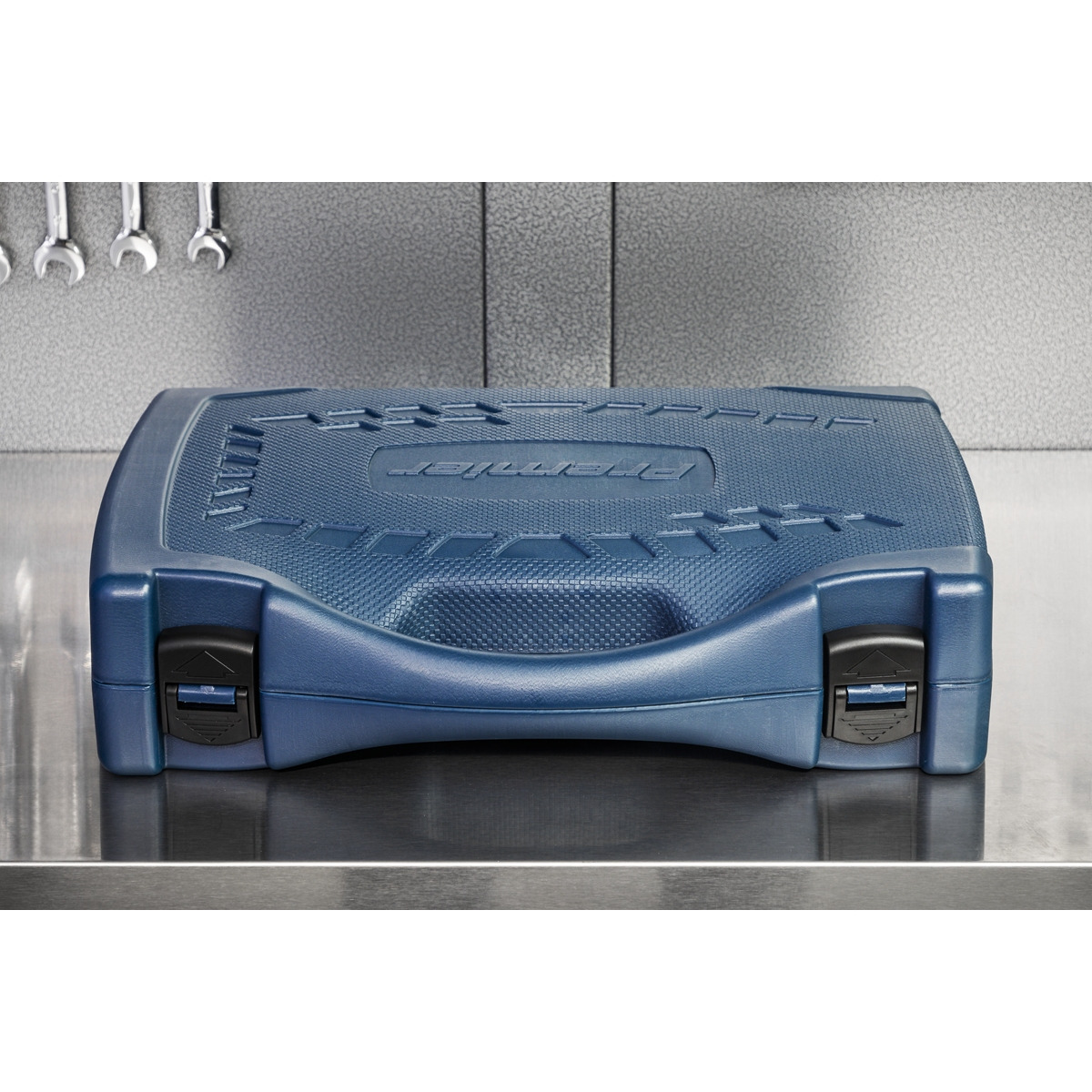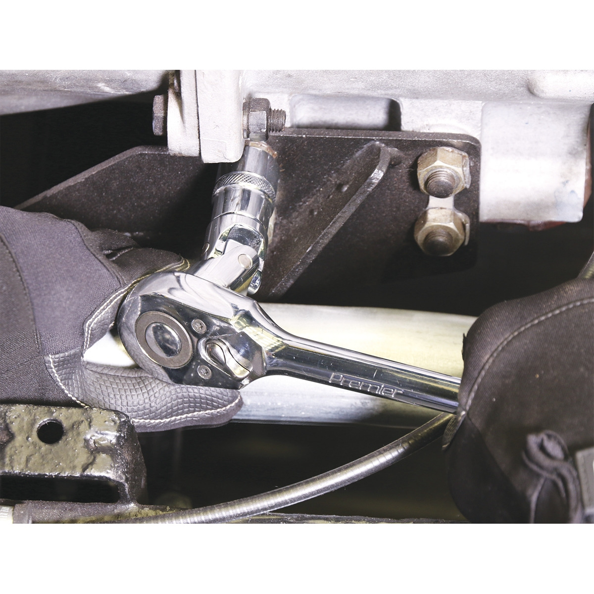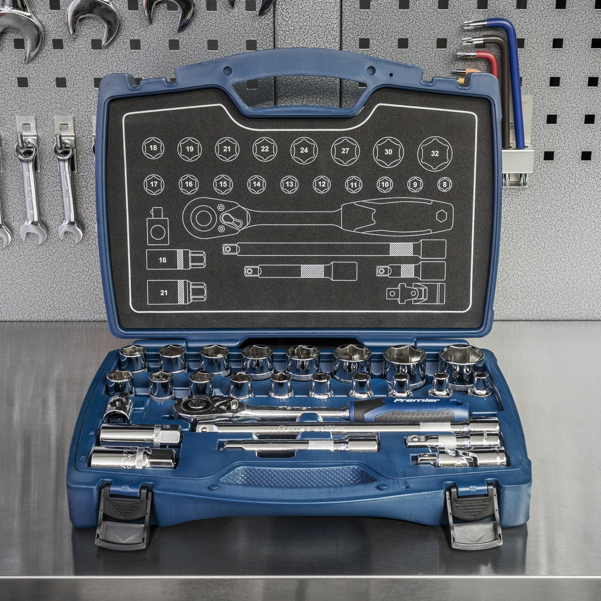 One of a comprehensive range of Premier Hand Tools, suitable for daily professional use. Heat treated, drop-forged Chrome Vanadium steel sockets and accessories with a fully polished mirror finish. Covers sizes from 8 to 32mm. Features 72-tooth extending ratchet with comfort grip and push-button quick release, extension bars, spark plug sockets, universal joint and T-bar adaptor. Includes contents map displayed inside the lid. Contents: Standard Sockets; 8, 9, 10, 11, 12, 13, 14, 15, 16, 17, 18, 19, 21, 22, 24, 27, 30, 32mm, Spark Plug Sockets; 16, 21mm, Extension Bars; 75, 125, 250mm, 1/2"Sq Drive 72-Tooth Extending Ratchet Wrench with Quick Release, Universal Joint, 3/8"Sq Drive - 1/2"Sq Drive Male Adaptor. Supplied in storage case. Lifetime guarantee*.