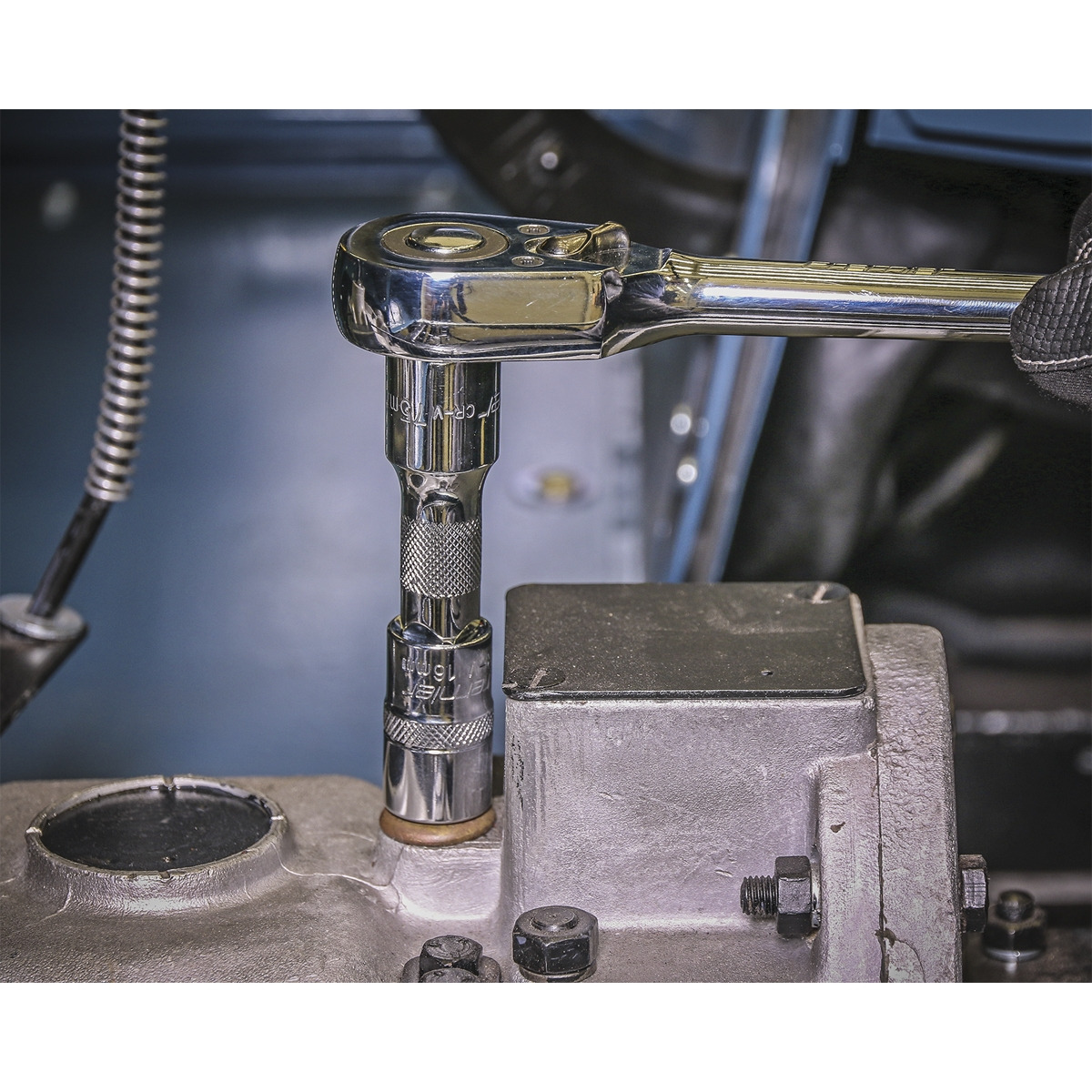 - Features 72-tooth extending ratchet with comfort grip and push-button quick release, extension bars, spark plug sockets, universal joint and T-bar adaptor.