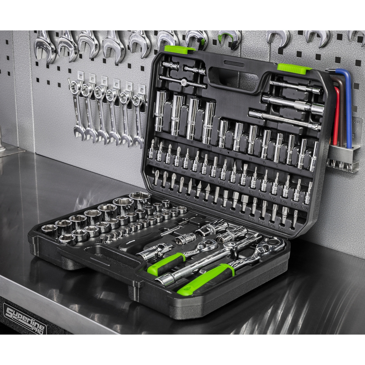- Includes 72-tooth comfort grip ratchet wrenches, spark plug sockets, extension bars, socket bits, bits, spinner handle and accessories.