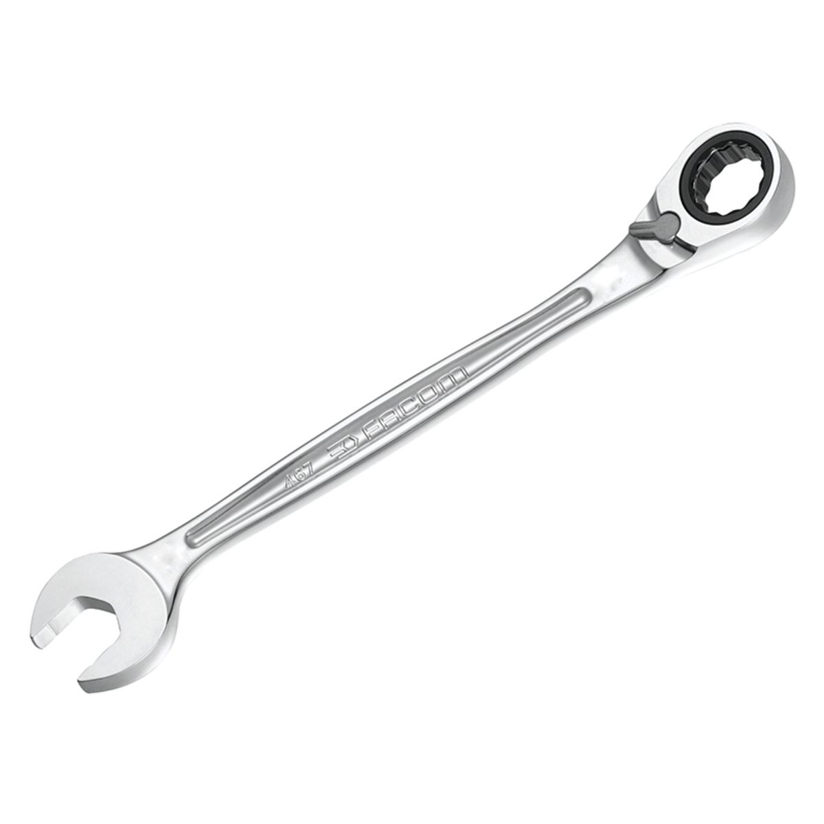 The Facom 467B Series Combination Ratcheting Spanners feature a reversible ratchet system incorporated within a compact ring head and a fixed open end. The wrench is angled at 15° and has a fine ratchet system which allows a 5° working arc. The spanners have a satin chrome finish. The ring end features the innovative Ring Stop system that prevents fasteners from going through or slipping off the wrench whist the open end features anti slip jaw design preventing slippage. Compact I-Beam shaft profile ensures comfort and allows the user to apply higher torque for longer periods.