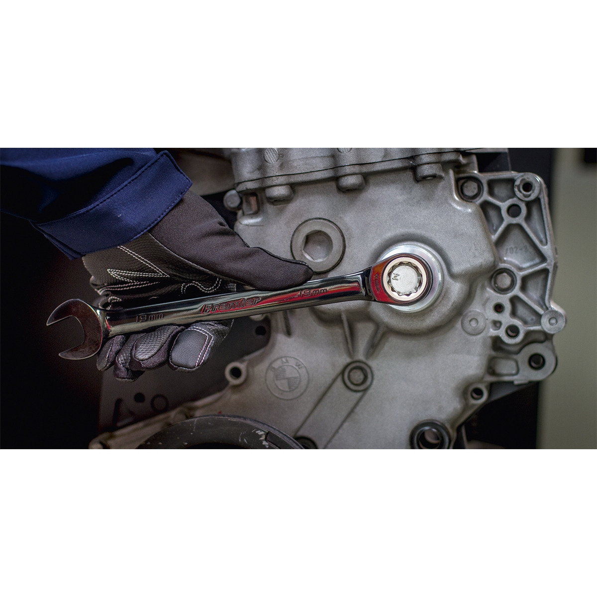 One of a comprehensive range of Premier Black Hand Tools, suitable for daily professional use. High quality slim style Chrome Vanadium steel spanners. Hardened and tempered with a black chrome finish for resistance to corrosion. 72-Tooth ultra-smooth WallDrive® ratchet ring requiring only 5° rotation to pick up the next tooth. Supplied on storage rack. Sizes: 8, 10, 12, 13, 14, 17, 19mm. Lifetime guarantee*.