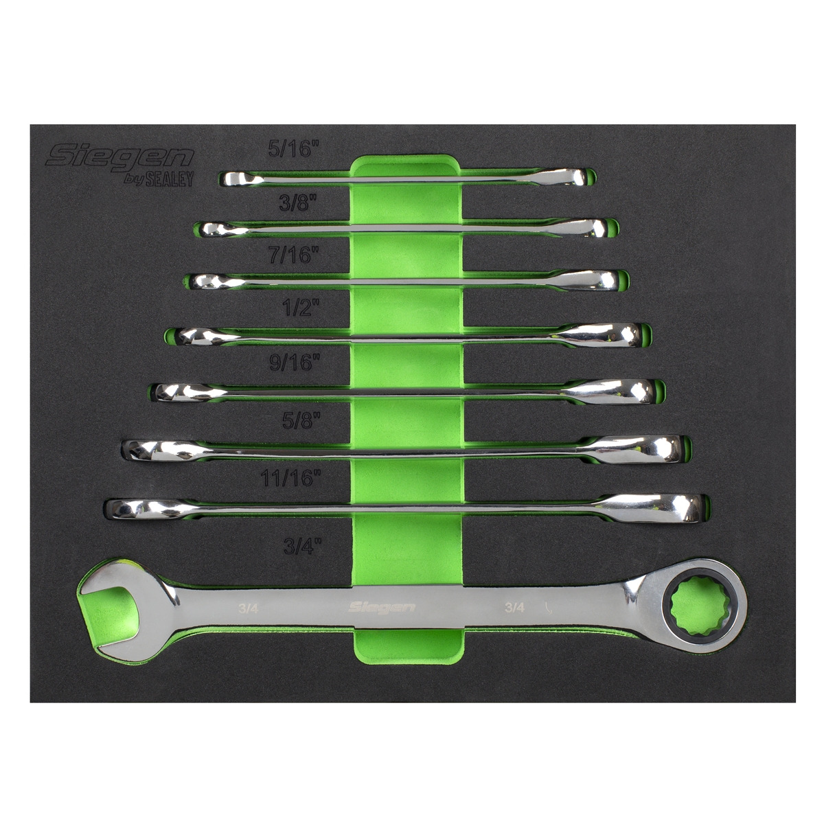SIEGEN - Part of the Sealey range of quality tools at competitive prices. DURABLE - Hardened and tempered Chrome Vanadium steel combination ratchet spanner set. 72-TOOTH - ratchet ring and gear set requiring only 5° rotation to pick up the next tooth, ideal for applications where space is limited. SIZES - 5/16", 3/8", 7/16", 1/2", 9/16", 5/8", 11/16", 3/4". STORAGE - Supplied in EVA foam tray. Lifetime guarantee*.