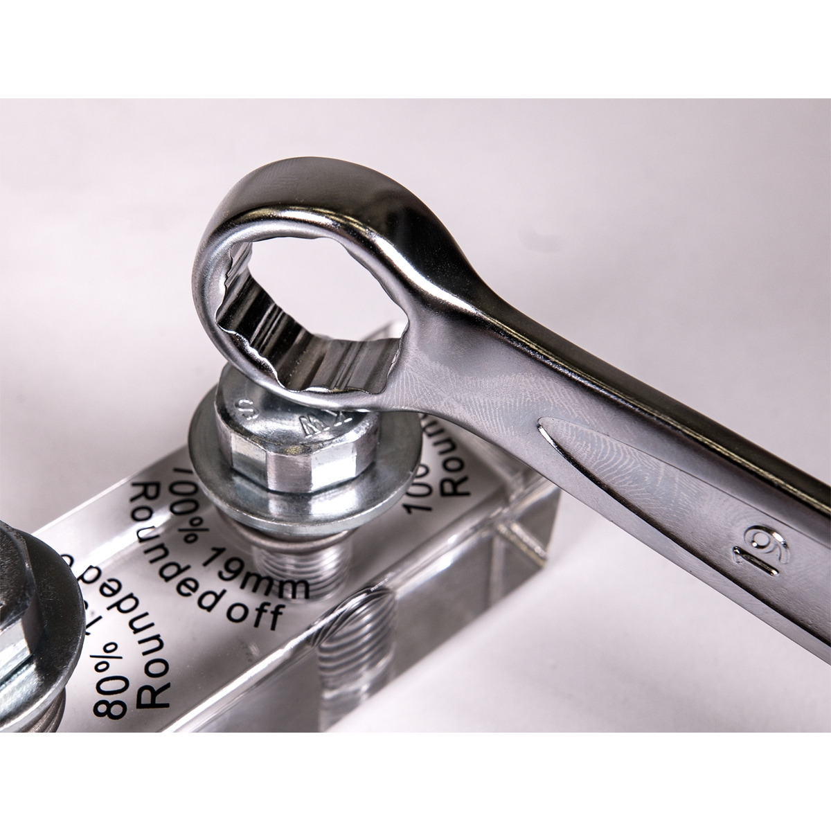 One of a comprehensive range of Premier Hand Tools, suitable for daily professional use. Drop-forged, Chrome Vanadium steel combination spanners. Hardened and tempered with a fully polished micro satin finish for corrosion resistance. 15° Offset ring ends keep knuckles clear of obstructions. 35° Angled offset open-end allows for improved access. Feature specially machined flutes in the walls of the ring end which enable use on up to 85% rounded fasteners. This not only provides added strength but also prevents further damage to worn or rusted fixings. Sizes: 8, 9, 10, 11, 12, 13, 14, 15, 16, 17, 18, 19mm. Supplied in folding storage rack. Lifetime guarantee*.