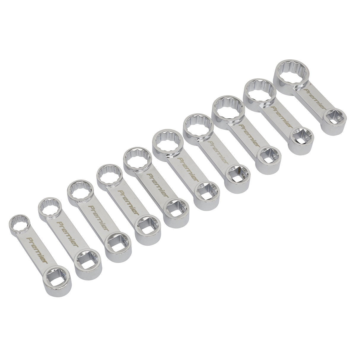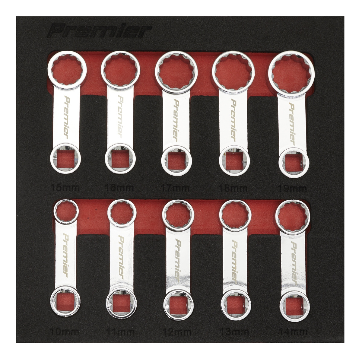SEALEY PREMIER - One of a comprehensive range of Premier Hand Tools, suitable for daily professional use. CHROME VANADIUM STEEL - Heat treated and hardened for extra resistance to corrosion with a fully polished mirror finish. 12-POINT WALLDRIVE® RINGS – Allows application of up to 30% more torque without damaging the fixing. STUBBY CONFIGURATION - Suitable for limited access applications. 10PC SET - Sizes: 10, 11, 12, 13, 14, 15, 16, 17, 18, 19mm. IDEAL FOR USE WITH TORQUE WRENCHES – Please note: a setting adjustment is required to compensate for the increased length of leverage when using these torque adaptors. RANGE OF SIZES – Min/Max length:65/70mm. SUPPLIED IN EVA FOAM STORAGE TRAY – Tray size (W x D x H): 185 x 185 x 32mm. LIFETIME GUARANTEE*.