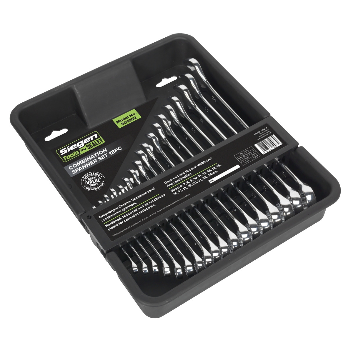 Part of the Siegen by Sealey range of quality tools at competitive prices. Drop-forged Chrome Vanadium steel combination spanners. Hardened, tempered and nickel chrome plated for corrosion resistance. Fully polished mirror finish. Open-end and 12-point WallDrive® ring combination. Sizes: 6, 7, 8, 9, 10, 11, 12, 13, 14, 15, 16, 17, 18, 19, 20, 21, 22, 24mm. Supplied in storage/carry rack. Lifetime guarantee*.