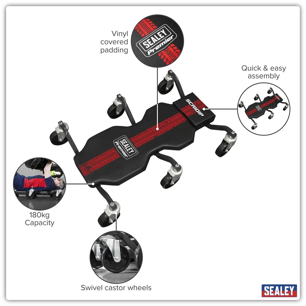 Sealey SCR101P Steel Creeper with 6 Rough Ground 5" Wheels & Headrest