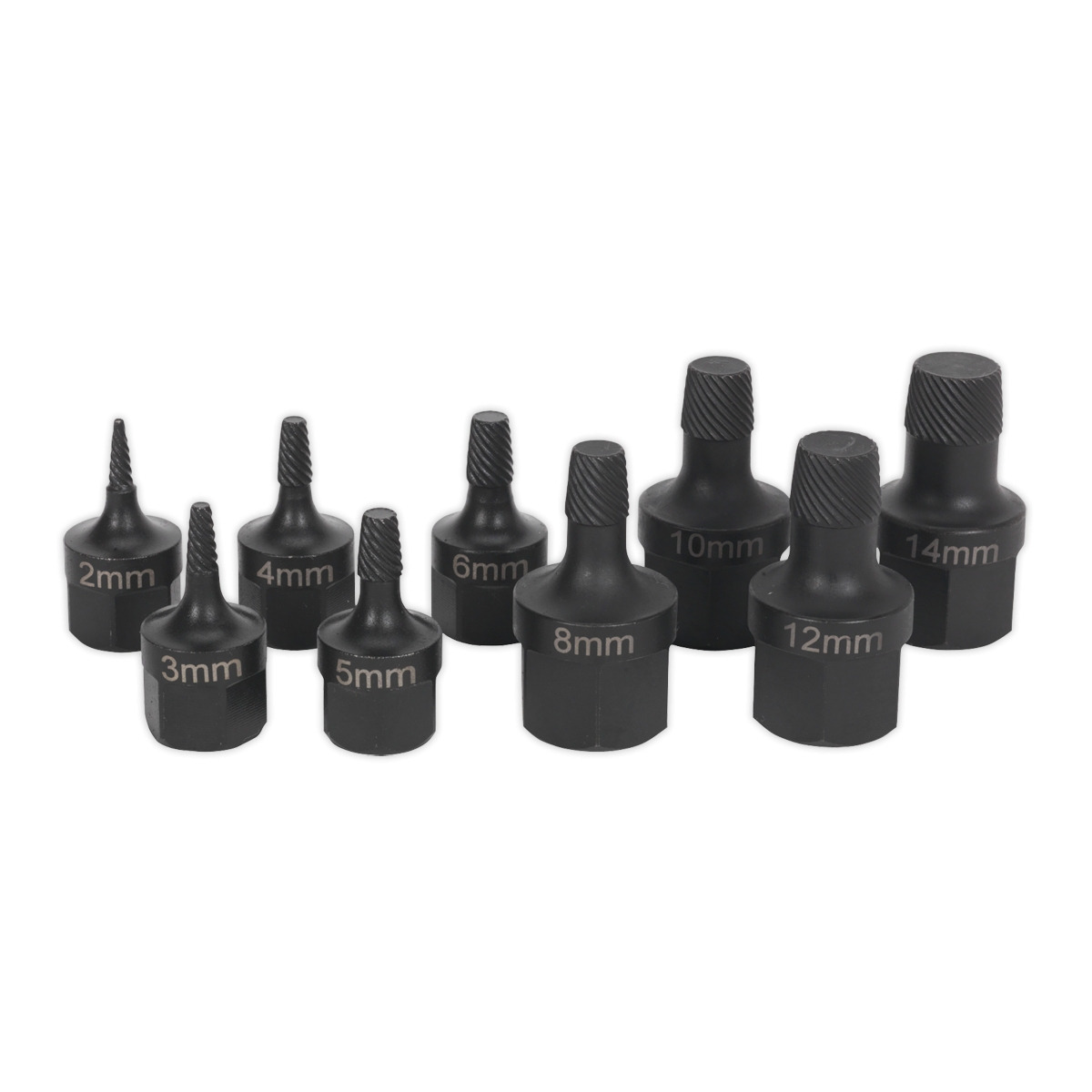 Suitable for the removal of broken studs and bolts. Left-hand tapered spiral design, tightens into pre-drilled stud/bolt as more torque is applied. Contents: 3/8"Sq/17mm Hex Drive; 2, 3, 4, 5, 6mm (36mm Length), 1/2"Sq/22mm Hex; 8, 10, 12, 14mm (45mm Length). Supplied on socket rail.