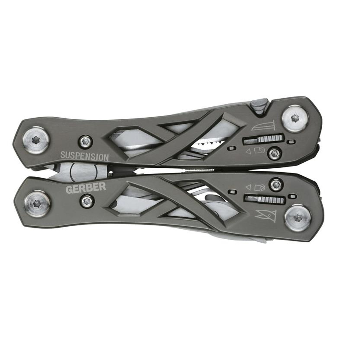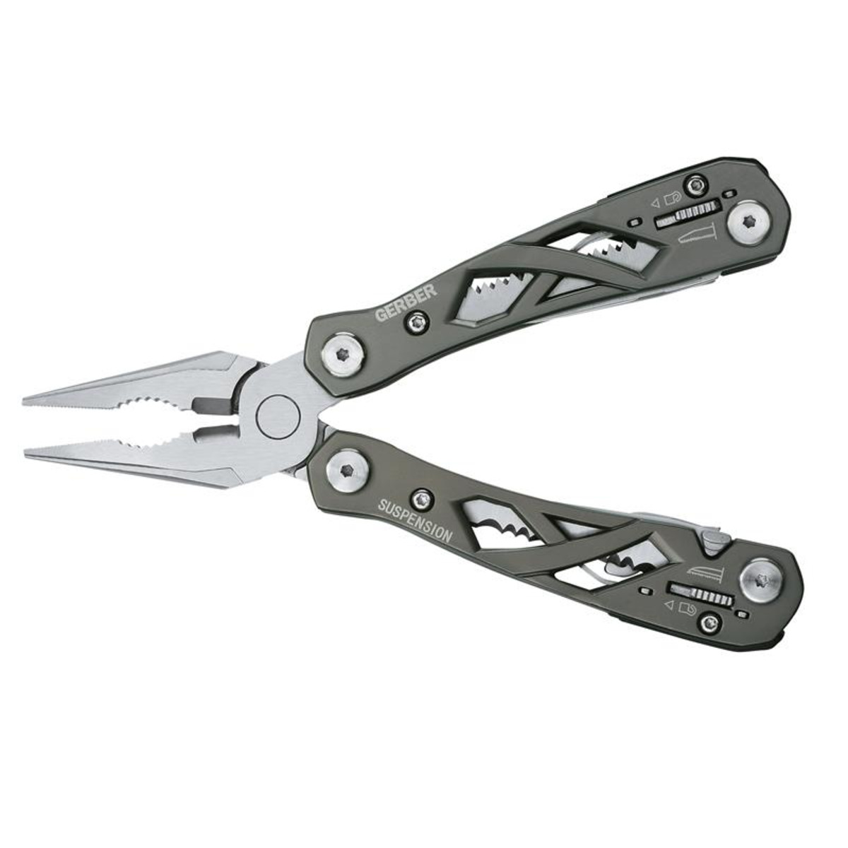The Gerber Suspension Multi Tool is the benchmark tool of convenience and durability. The easily accessed butterfly design features a lightweight frame for long days and tired hands. Inspired by the bridges of Gerber’s hometown in Portland, Oregon. It features 12 tools: needle nose pliers (spring loaded), 'V-Cut' wire cutters, scissors, fine blade, serrated blade, saw, Phillips screwdriver, small flat screwdriver, medium flat screwdriver, bottle opener, can opener and lanyard ring.