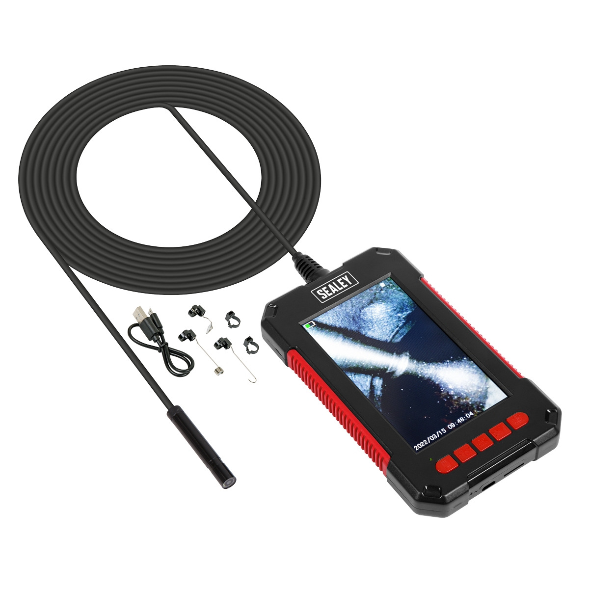 Large 110mm LCD screen with a resolution up to 1080p full HD for video recording, playback and still images. Tablet design makes the image incredibly clear but also very portable. Features controls for light intensity, digital zoom and image rotation. Waterproof probe pod with IP67 rating. Powered by 2600mAh rechargeable battery with 5 hour working time (USB Charging cable supplied). SD card can be installed to achieve file storage (not included). Kit includes 45° mirror, hook and magnetic pick-up. Cable Length: 2m.