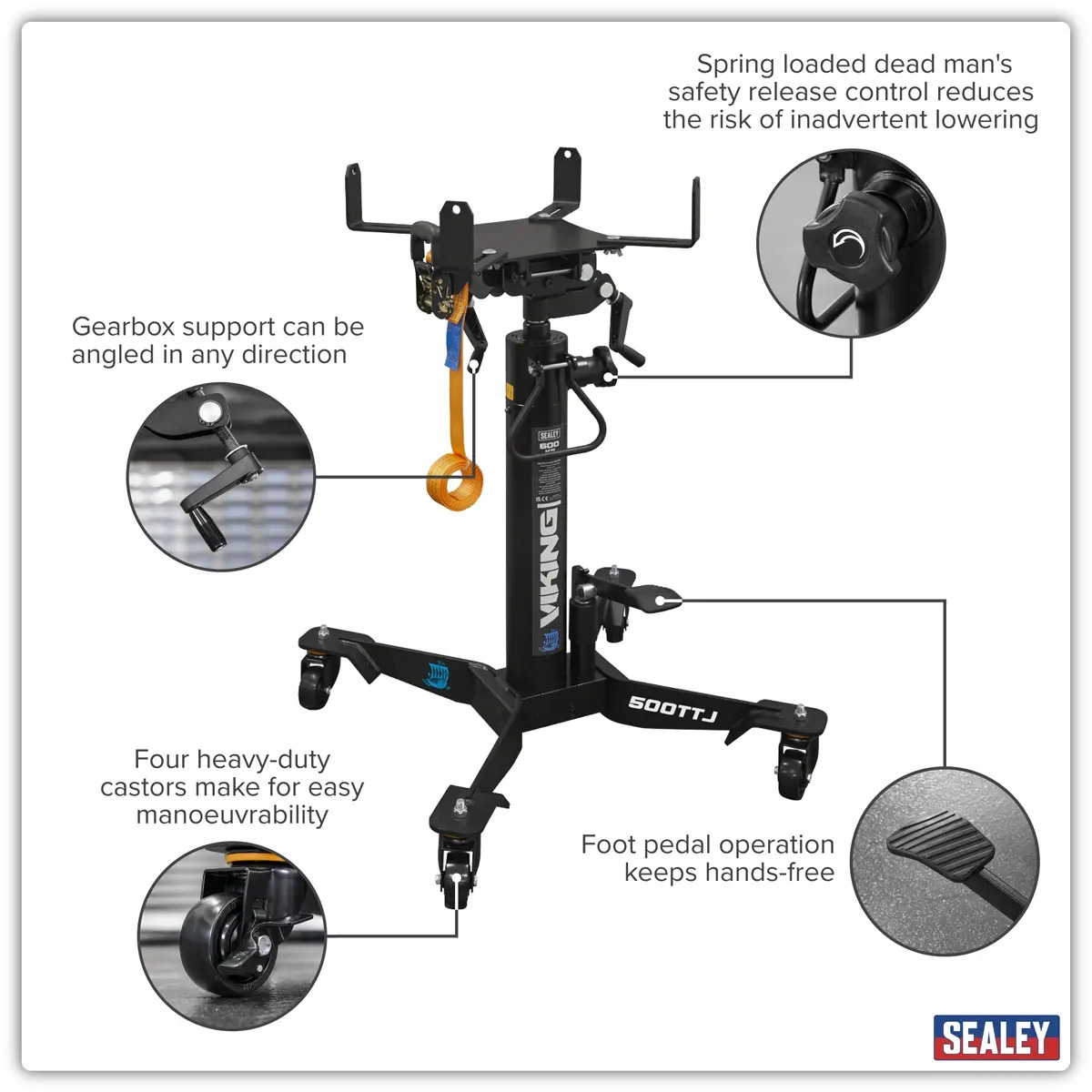 TWIN AXIS SADDLE ADJUSTORS - The gearbox support can be angled in any direction. TELESCOPIC PISTON - 2-Stage model for reduced clearance lifts. HARD CHROME - Features a hardened chrome plated piston rod. HANDS-FREE - Foot pedal operation keeps hands free. DEAD MAN'S RELEASE CONTROL - Spring loaded dead man's safety release control reduces the risk of inadvertent lowering. HEAVY DUTY CASTORS - Four heavy duty castors, non-marking nylon wheels, on a sturdy base, make for easy manoeuvrability.