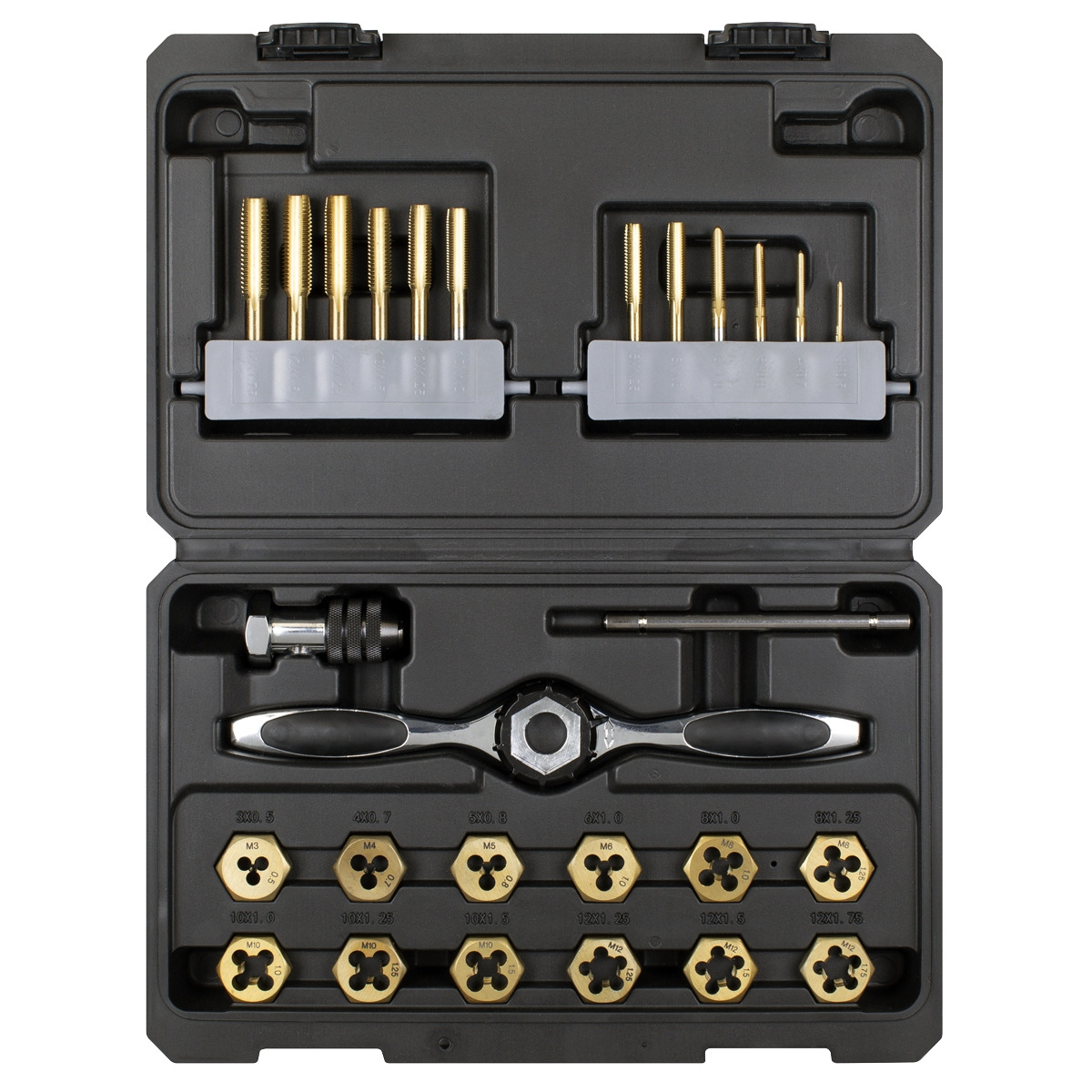PREMIUM - M3 to M12 high quality titanium coated taps and dies. HIGH TORSION - Features hex shaped dies providing a more secure fit in the die holder. DIVERSE - Dies can also be used with a socket or spanner. CONTENTS: Taps & Dies; M3 x 0.5, M4 x 0.7, M5 x 0.8, M6 x 1, M8 x 1, M8 x 1.25, M10 x 1, M10 x 1.25, M10 x 1.5, M12 x 1.25, M12 x 1.5 , M12 x 1.75 T-Type Tap Wrench, Hex Die Handle. RETENTION - Supplied in storage case.