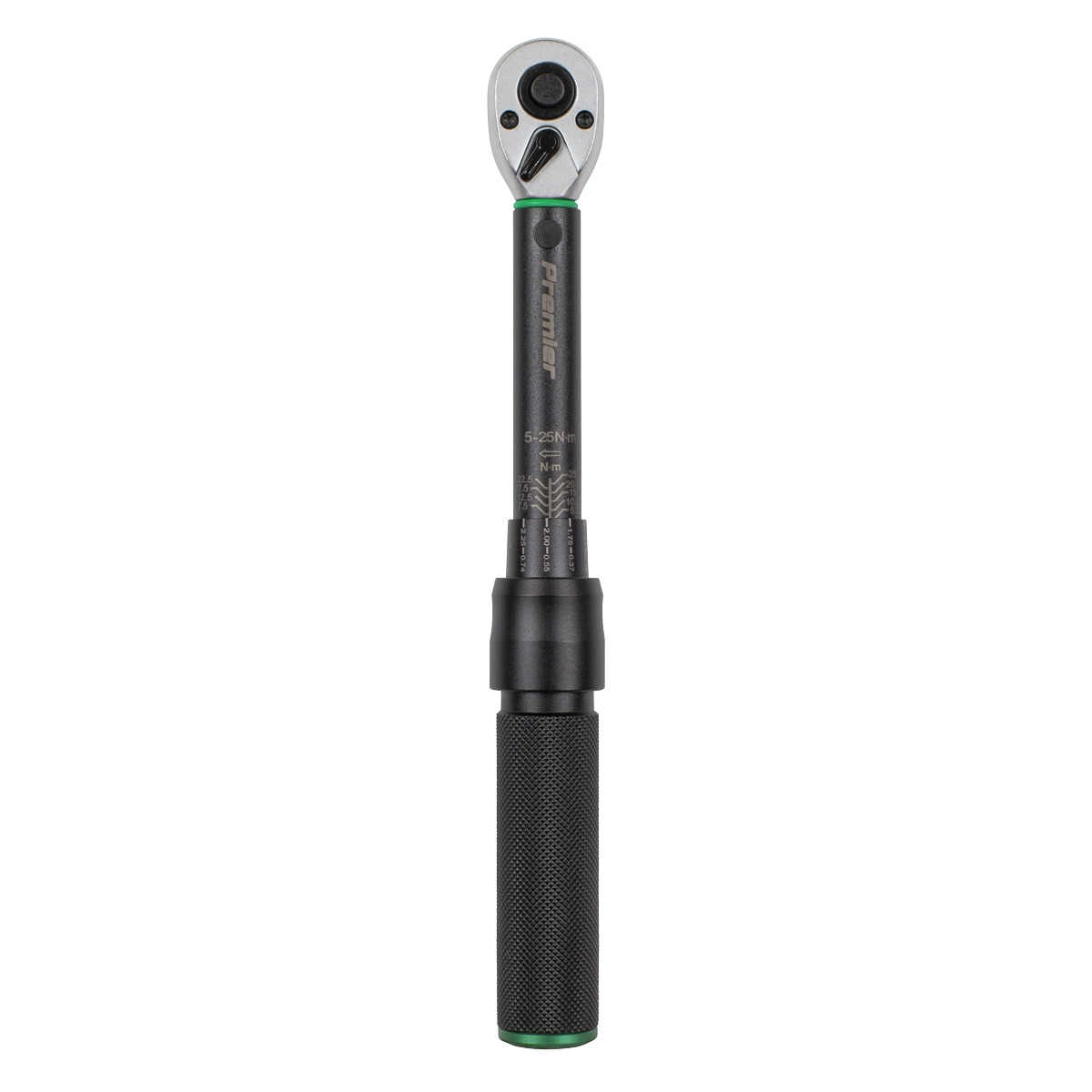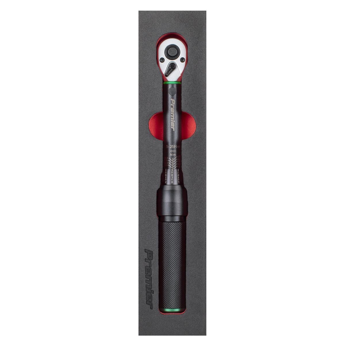PREMIER BLACK – One of a comprehensive range of hand tools, suitable for daily and professional use. RANGE – 5-25Nm (3.7-18.5lb.ft). FLIP REVERSE DRIVE - Chrome Vanadium steel ratchet head with smooth action mechanism. CALIBRATED IN ACCORDANCE WITH BS EN ISO 6789:2017 - Wrenches are individually tested to standards with ±4% accuracy and each wrench is issued with an individually numbered test certificate. ALUMINIUM KNURLED HANDLE - For comfort and control. STORAGE - Supplied in an EVA foam storage tray. GUARANTEE – Premier Black Series range have a lifetime guarantee.