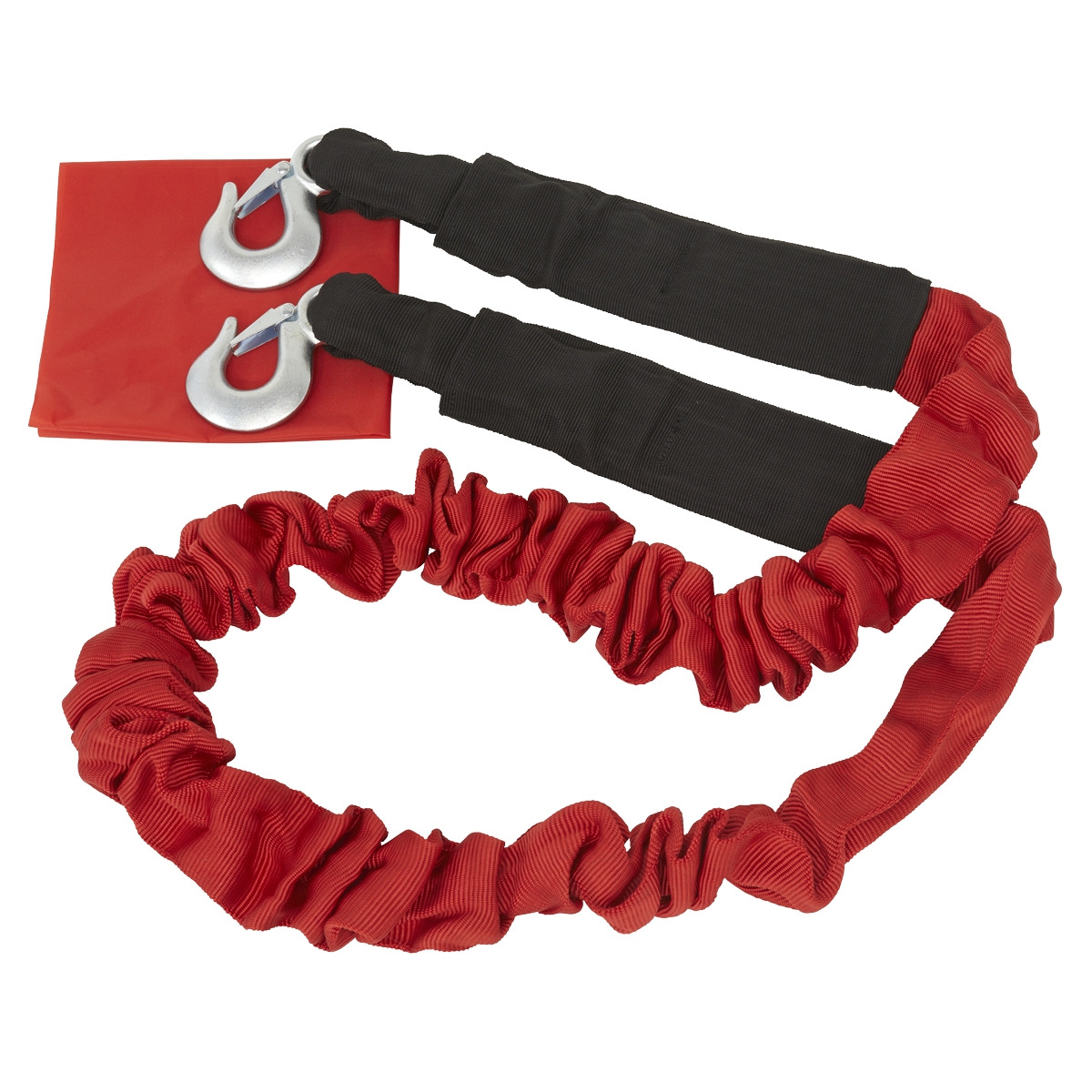 ELASTICATED - Webbing design helps prevent tow rope dragging on the ground during overrun. HEAVY-DUTY - Forged hooks with snap shackles. REINFORCED - Ropes feature tough, heavy-duty stitched hook retaining sleeves. VISIBILITY - Bright looped flag enhances visibility for improved safety during use. STRONG - Rolling Load Capacity: 5000kg.