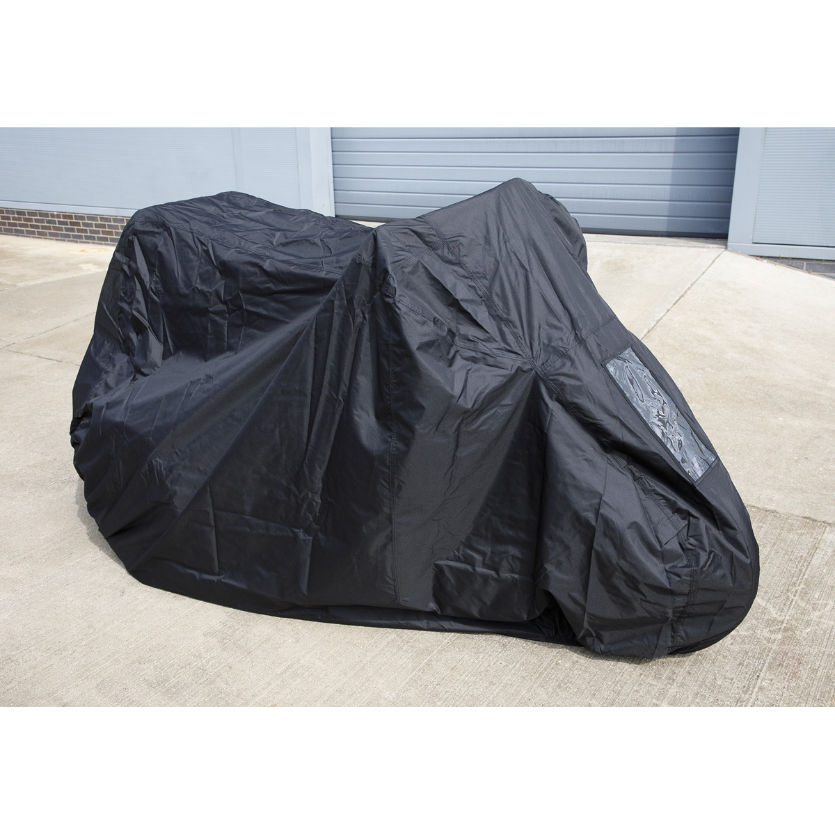 Ideal for protection, rain or shine, against weathering and fading. For smaller motorcycle derived trikes such as Virago or Shadow models or newer reverse trikes with two front wheels. Has a clear PVC pocket to accept Model No. SPP01 Solar Panel (requires Model No. SPP01.A Adaptor) to enable battery charging while cover is fitted to the motorcycle without the need for mains power supply. Elastic corners with strap and buckle for easy and secure fitting. Dimensions (L x W x H): Length; 2500mm, Front Top Width; 1000mm, Front Bottom Width; 470mm, Rear Bottom Width; 1550mm, Front Height; 1250mm, Rear Height; 1400mm. Made from Oxford 300D material. Supplied in a storage bag.