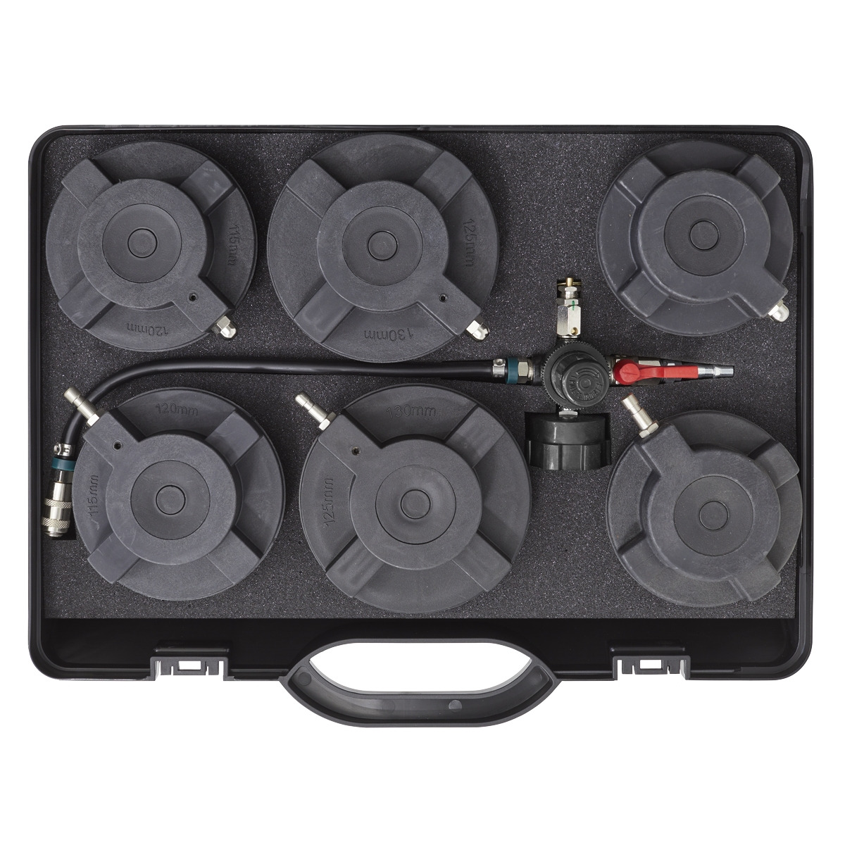 Designed to charge the turbo/intercooler system with a low pressure of regulated workshop air to show the presence of leaks within the system. Kit supplied with three pairs of stepped adaptors to fit most sizes of hose found on heavy commercial vehicles. Features a pressure gauge, shut-off valve and pressure release valve. Adaptor Sizes: 105-110, 115-120, 125-130mm. Supplied in storage case.