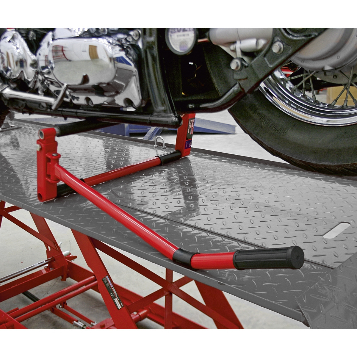 - Quickly and safely lifts and stabilises front or back of motorcycle with a traditional style double cradle frame design that has no engine, transmission or exhaust protrusions.