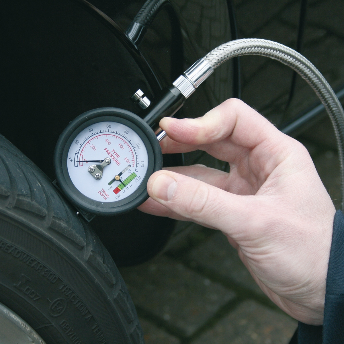 Robust gauge with protective rubber bumper reading up to 8bar (120psi). Fitted with 335mm armoured flexible hose and pressure release button. Integral colour-coded tyre depth gauge - 0-10mm.