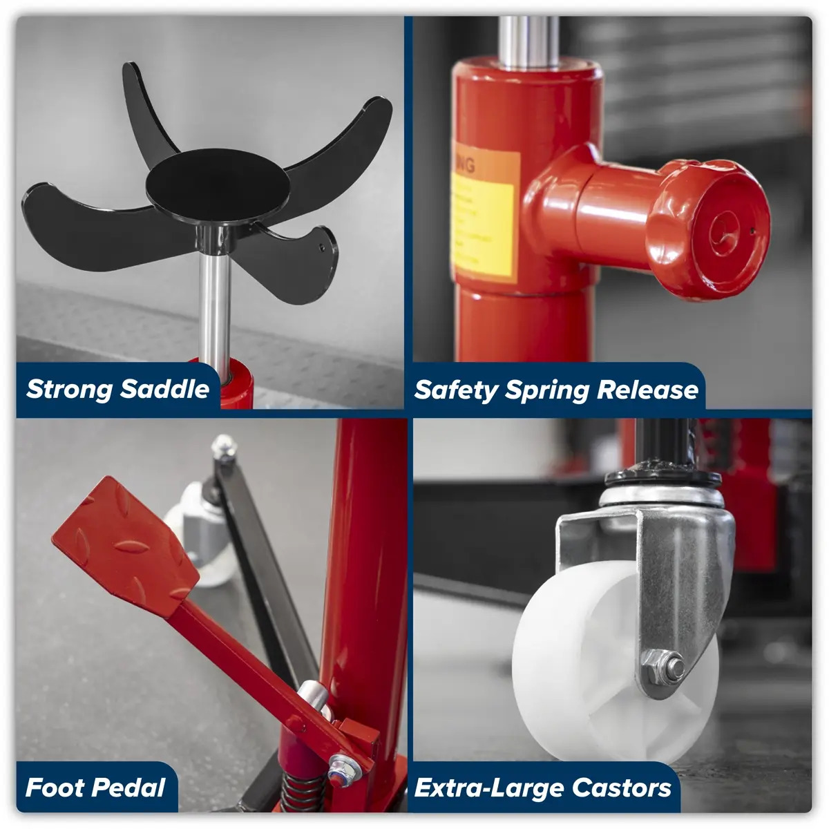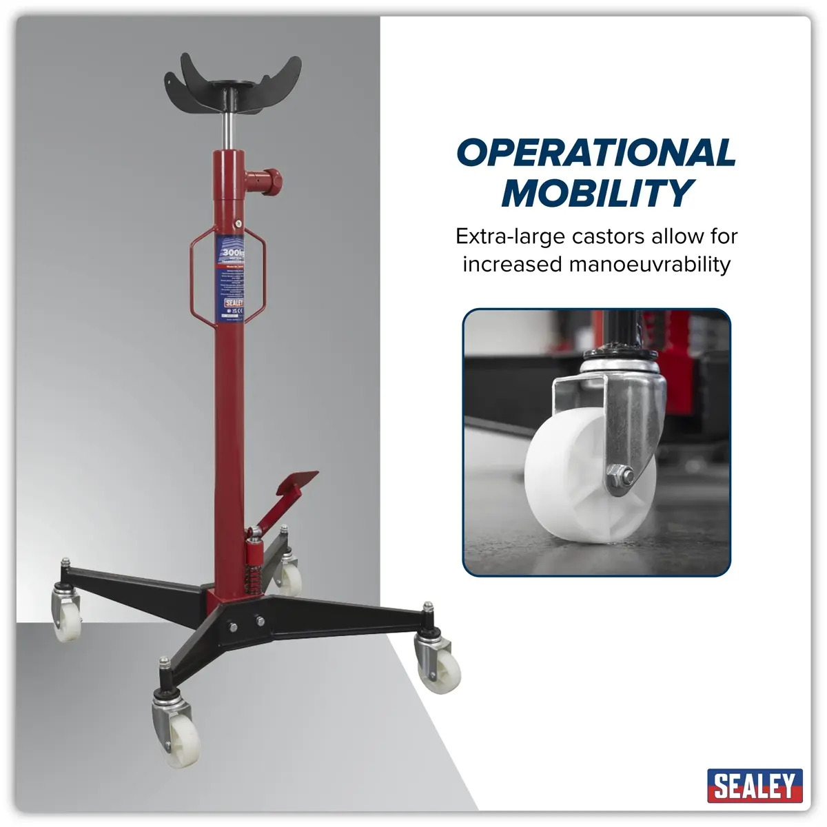 High-speed lift to gearbox - just lift piston. Foot pedal operation keeps hands-free. Spring loaded dead man's safety release control reduces the risk of inadvertent lowering. Highly manoeuvrable on castors.