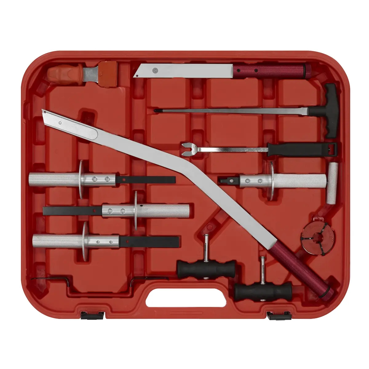 COMPLETE KIT - Suitable for a range of vehicle applications. DESIGNED FOR THE PROFESSIONAL - Easy and efficient removal of bonded and rubber seals in windshields and most rear and side windows. MANUFACTURED FROM HEAT-TREATED CHROME - For durability and resistance to corrosion. T-HANDLE DESIGN- Allows for secure and comfortable grip in application and easy threading of wire. SUPPLIED IN STORAGE CASE - For portability and storage solutions. 14PC KIT - Contents: Razor Scraper, Trim Clip Remover, T-Handled Wire Starter Tool, Medium Urethane Knife, Long Urethane Knife, Bonded Screen Removal Tool, Cowling Removal Key, 13mm Pinch Weld Scraper, 16mm Pinch Weld Scraper, 19mm Pinch Weld Scraper, Trim Pad Remover, Wire Grip Handles (x2), Cutting Wire.